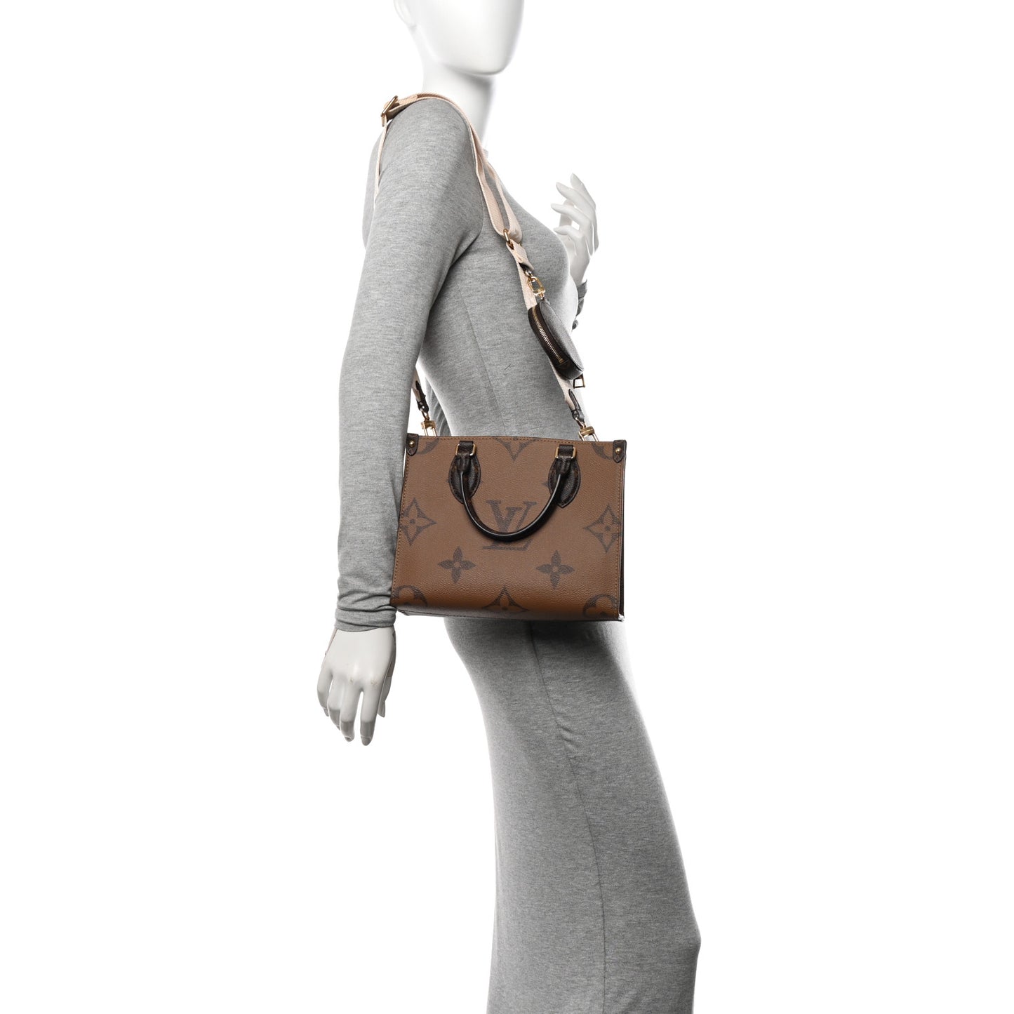 his is an authentic LOUIS VUITTON Reverse Monogram Giant Onthego PM. This tote is crafted of classic and oversized versions of Louis Vuitton monogram coated canvas in light and dark brown. The bag features rolled top handles, an optional beige canvas shoulder strap, and polished brass hardware. The top is open to a red fabric interior with zipper and patch pockets.Follow this item for alerts. Louis Vuitton is a registered trademark of Louis Vuitton. FASHIONPHILE is not affiliated with Louis Vuitton.
