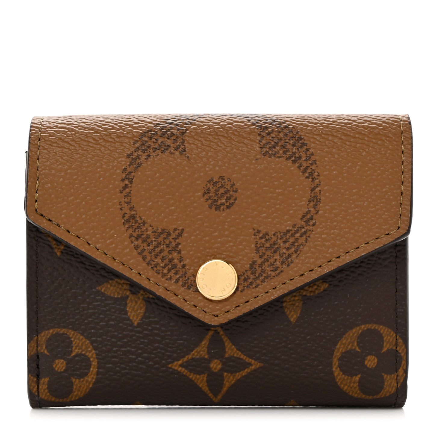 This is an authentic LOUIS VUITTON Reverse Monogram Giant Zoe Wallet. This wallet is crafted of Louis Vuitton giant and classic monogram on brown toile-coated canvas. It features an envelope-style flap with a gold snap closure that opens to a black cross-grain leather interior with card slots, a bill compartment, and a zipper pocket.Follow this item for alerts. Louis Vuitton is a registered trademark of Louis Vuitton. FASHIONPHILE is not affiliated with Louis Vuitton.