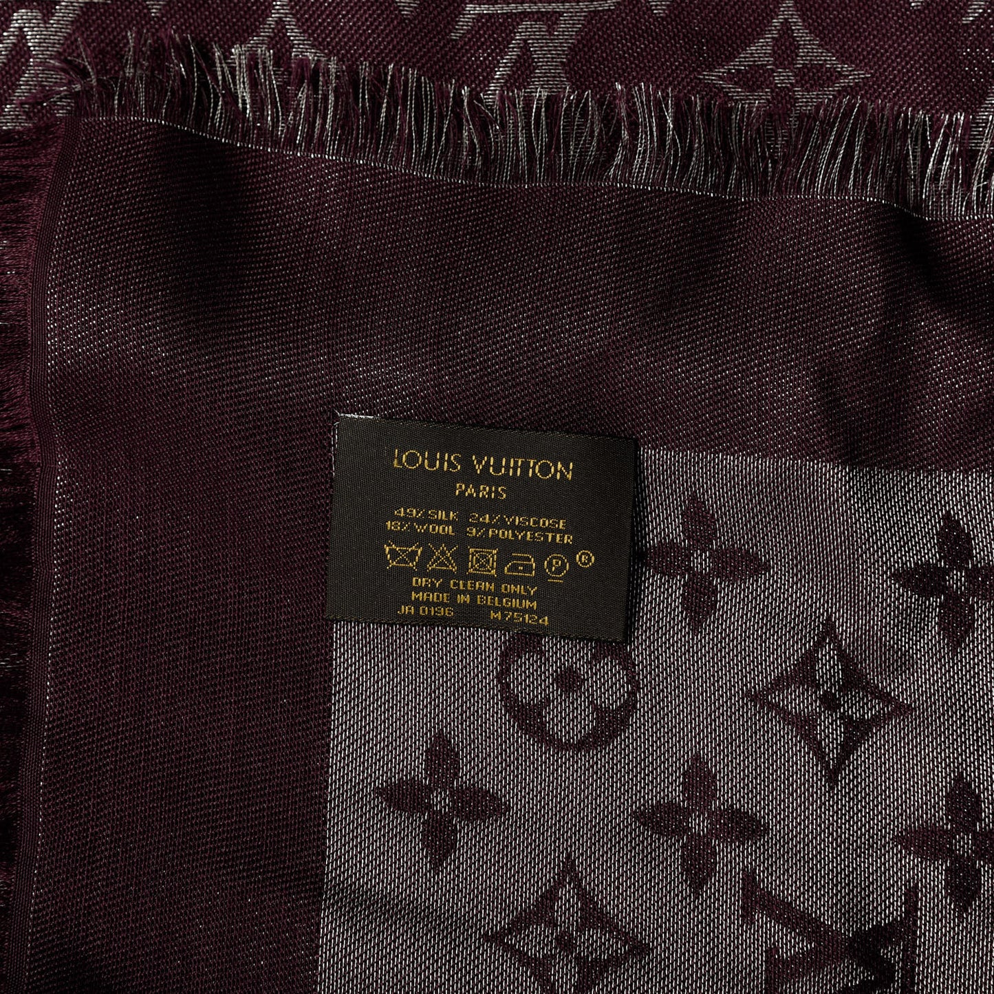 This is an authentic LOUIS VUITTON Silk Lurex Wool Monogram Shine Shawl in Amarante. This stunning dark purple shawl is crafted of 49% silk, 24% viscose, 18% wool and 9% polyester. This sizable shawl features a shiny Louis Vuitton monogram with a fringe detail along the border. This is a stunning shawl that will be ideal for many occasions for comfort and style, from Louis Vuitton!Follow this item for alerts. Louis Vuitton is a registered trademark of Louis Vuitton. FASHIONPHILE is not affiliated with Louis Vuitton.