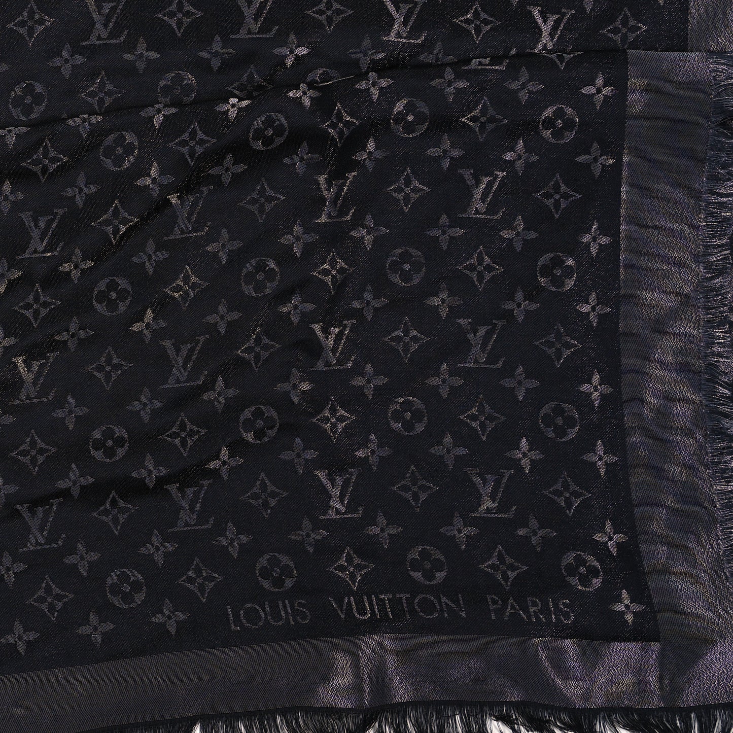 This is an authentic LOUIS VUITTON Silk Lurex Wool Monogram Shine Shawl in Black. This stylish shawl is crafted of 47% silk, 26% viscose and 17% wool in metallic black. The large shawl features a tonal Louis Vuitton monogram with fringe trim.Follow this item for alerts. Louis Vuitton is a registered trademark of Louis Vuitton. FASHIONPHILE is not affiliated with Louis Vuitton.
