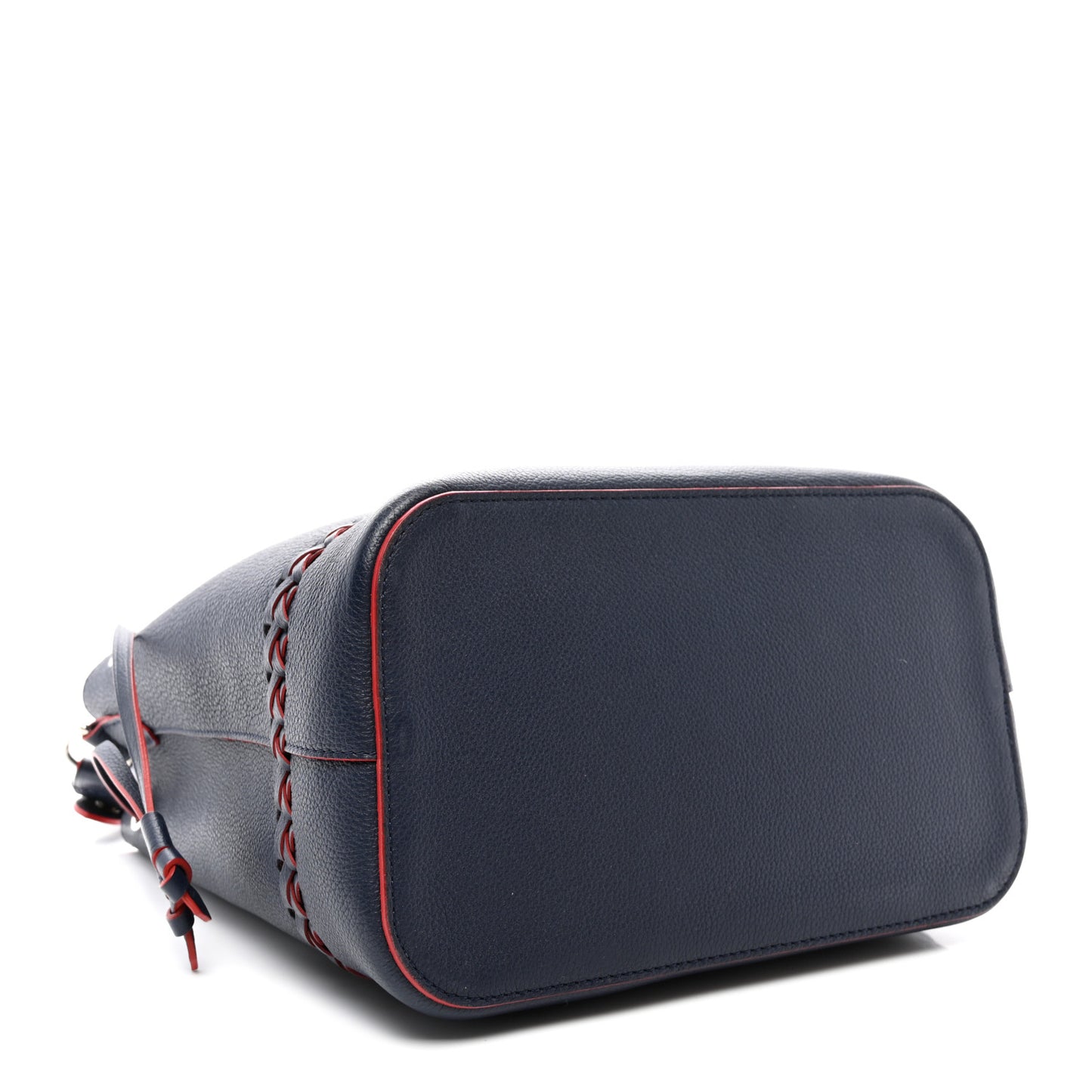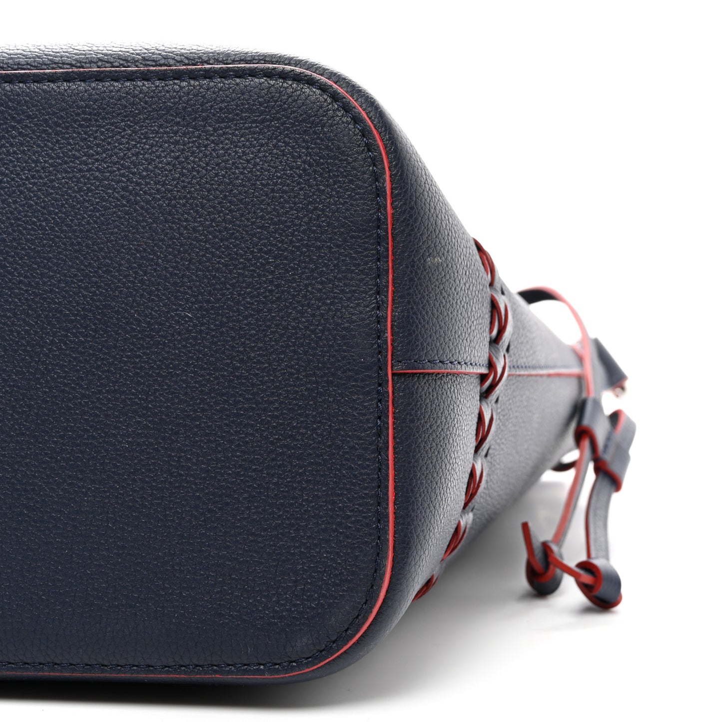 This is an authentic LOUIS VUITTON Soft Calfskin Braided Lockme Bucket in Marine and Rouge. This chic bucket shaped bag is crafted of smooth calfskin leather in navy blue. The tote features a long leather shoulder strap and side cinch cords with red trim glazing and polished silver hardware. The top is open to a red microfiber interior with a hanging zipper and patch pocket panel.Follow this item for alerts. Louis Vuitton is a registered trademark of Louis Vuitton. FASHIONPHILE is not affiliated with Louis Vuitton.