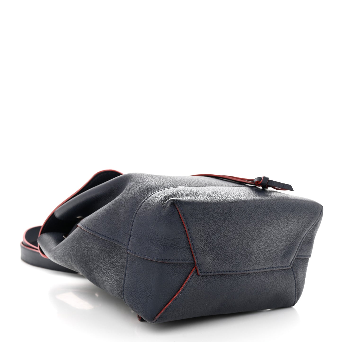 This is an authentic LOUIS VUITTON Soft Calfskin Lockme Backpack in Marine and Rouge. This chic small backpack is crafted of grained calfskin leather in navy with contrasting red resin glazing. The backpack features a calfskin handle, adjustable shoulder straps, top drawstring, and a front flap with a polished silver Louis Vuitton turn lock. This opens to a red microfiber interior with a large hanging pocket.