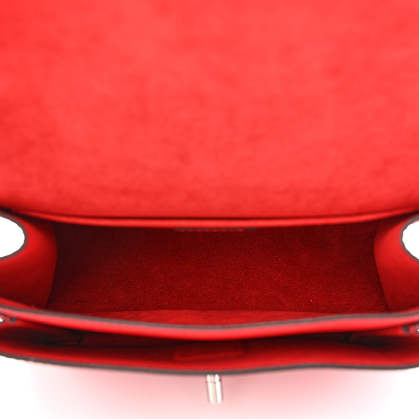 This is an authentic LOUIS VUITTON Soft Calfskin My Lockme Chain Bag BB in Poppy. This stylish soft handbag is crafted of supple calfskin leather in red. The shoulder bag features a silver chain shoulder strap and a silver LV turn-lock closure on the front flap. This opens to a microfiber interior with a front pocket and patch pocket.