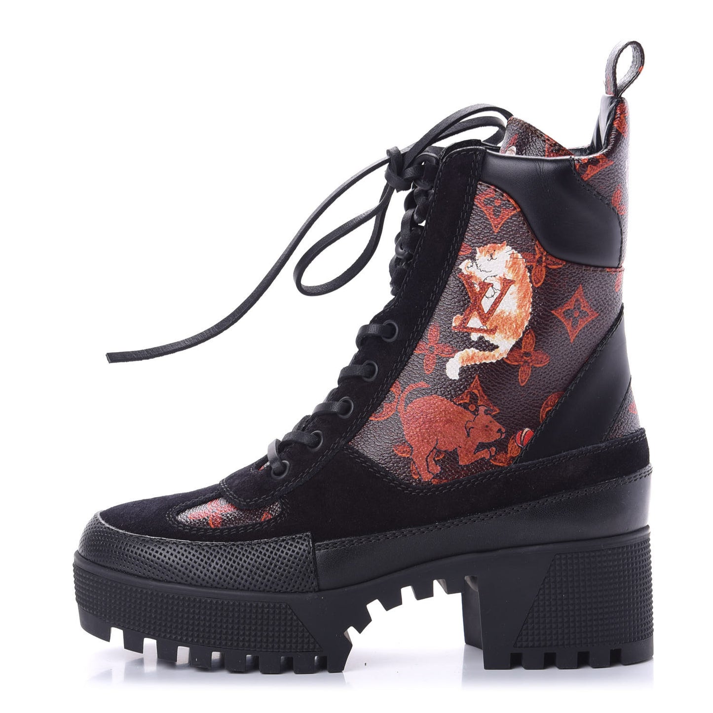 This is an authentic pair of LOUIS VUITTON Transformed Monogram Grace Coddington Catogram Laureate Platform Desert Boots size 36 in Black and Marron. These chic desert boots are crafted of black suede, smooth leather, and monogram coated canvas printed with cats and dogs. The boots feature black leather laces, a 1.25-inch platform, and a 2-inch heel. These are excellent boots for everyday wear, with the luxury and style only from Louis Vuitton!
