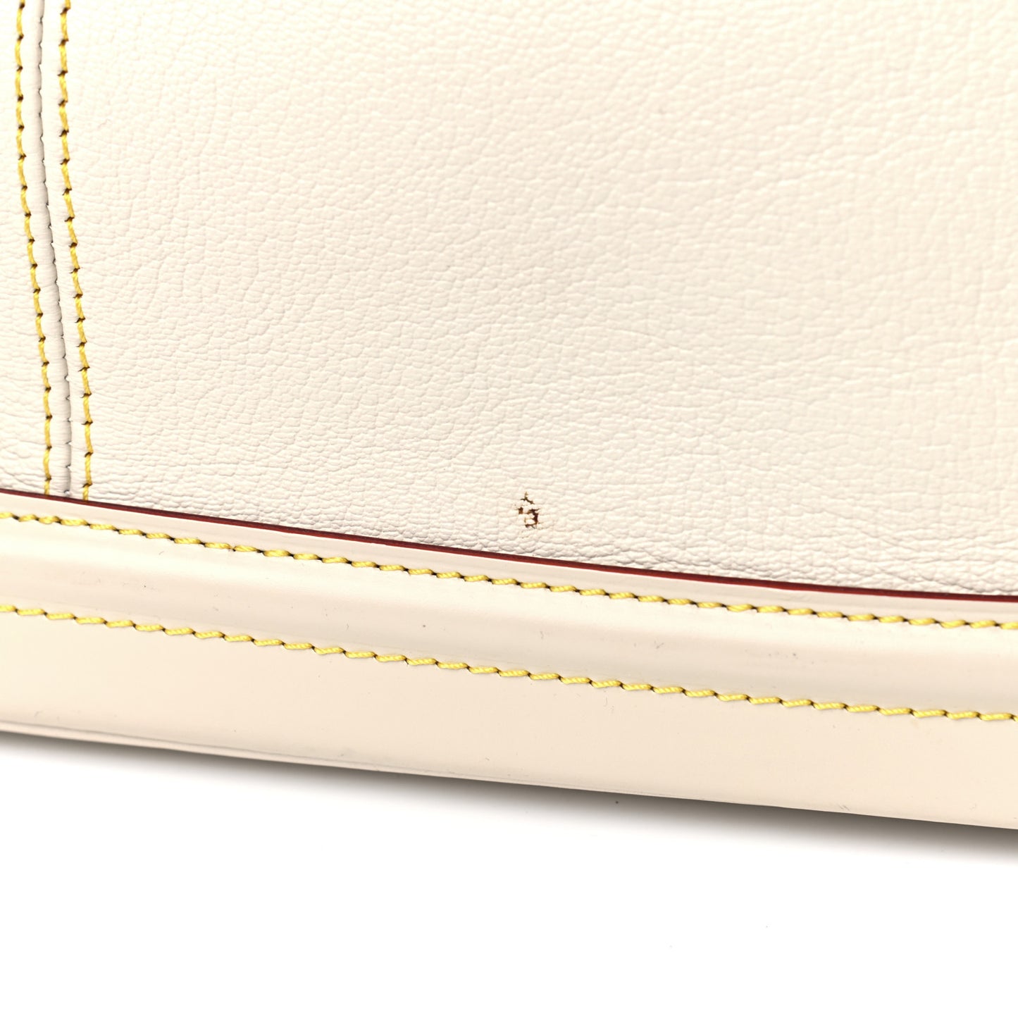 This is an authentic LOUIS VUITTON Suhali Lockit MM in White. This stylish tote is crafted of fine suhali goatskin leather in white. The handbag features rolled leather top handles, a hanging clochette with decorative yellow stitching and a top zipper with a leather zipper pull and a padlock. This opens to a white Louis Vuitton logo fabric interior with zipper and patch pockets.Follow this item for alerts. Louis Vuitton is a registered trademark of Louis Vuitton. FASHIONPHILE is not affiliated with Louis Vuitton.