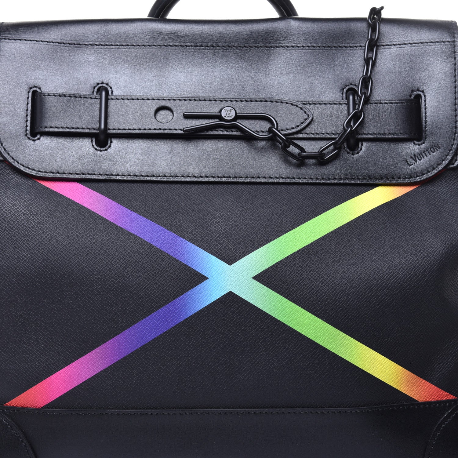 This is an authentic LOUIS VUITTON Taiga Rainbow Steamer PM in Black. This chic shoulder bag from Virgil Abloh's collection is featured in classic taiga leather in black with rainbow tones on the front. The bag features as rolled leather top handle, an optional and adjustable shoulder strap, matte black hardware , and a rear zipper pocket. This opens to a black fabric interior with patch pockets.Follow this item for alerts. Louis Vuitton is a registered trademark of Louis Vuitton. FASHIONPHILE is not affiliated with Louis Vuitton.