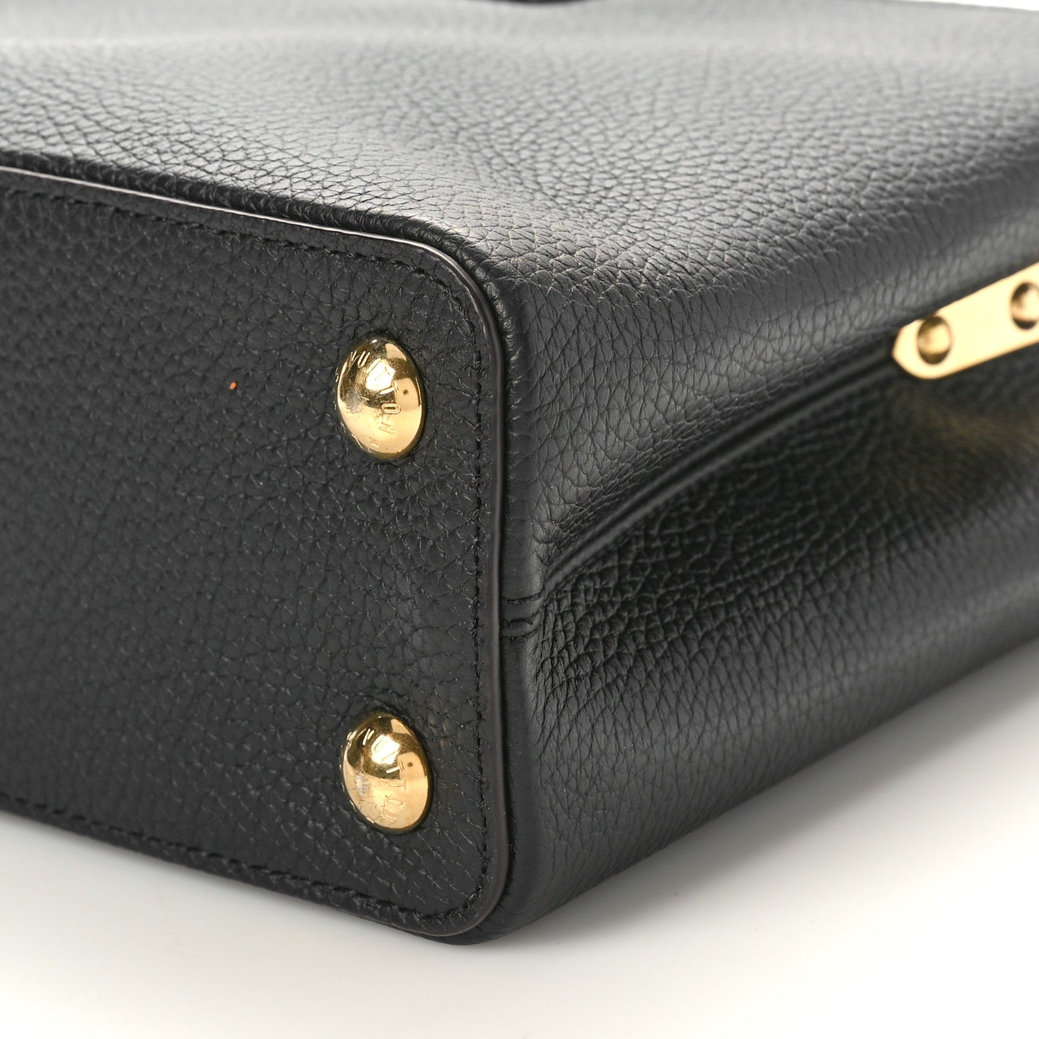 This authentic LOUIS VUITTON Taurillon Capucines BB in Black. This beautiful bag is crafted of textured leather in black. This handbag features an leather top handle, optional shoulder strap, a flap closure, and black hardware. The top opens to a black leather interior with a zipper pocket.Follow this item for alerts. Louis Vuitton is a registered trademark of Louis Vuitton. FASHIONPHILE is not affiliated with Louis Vuitton.