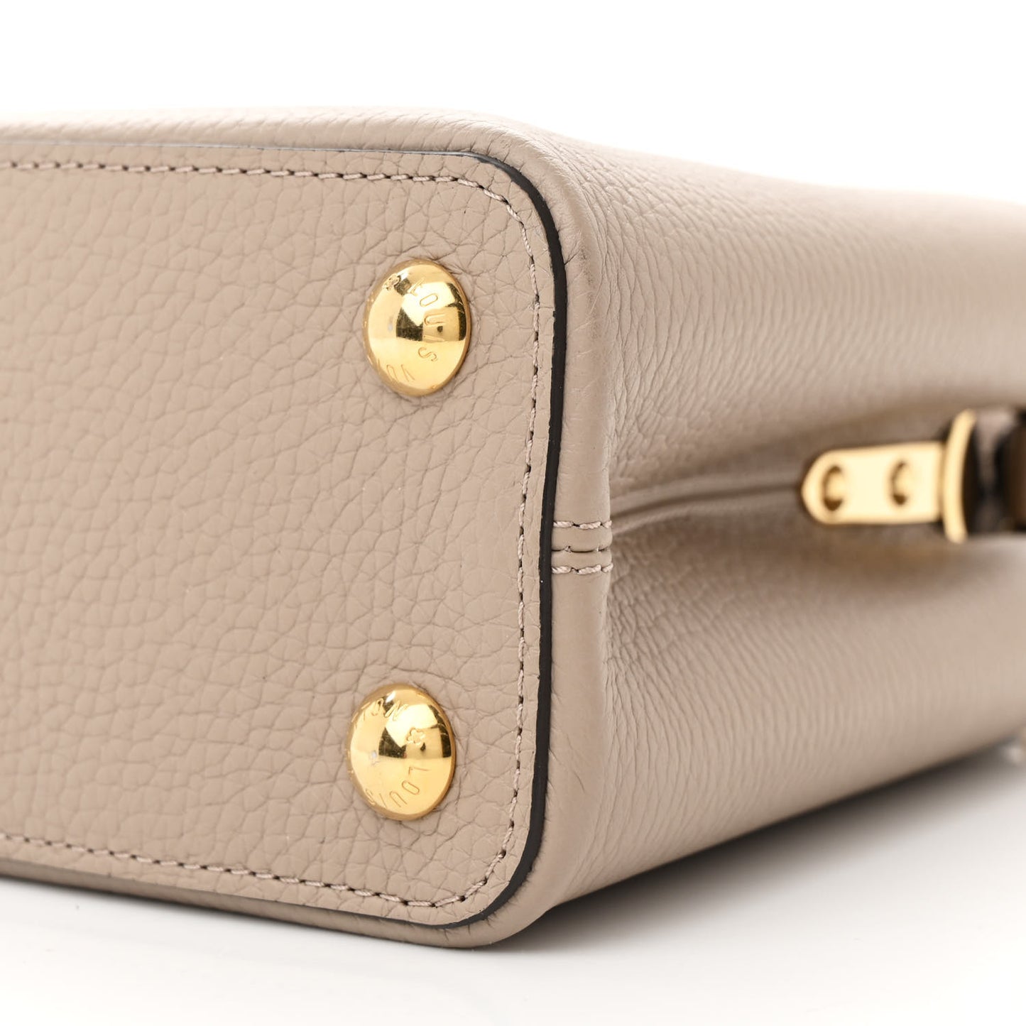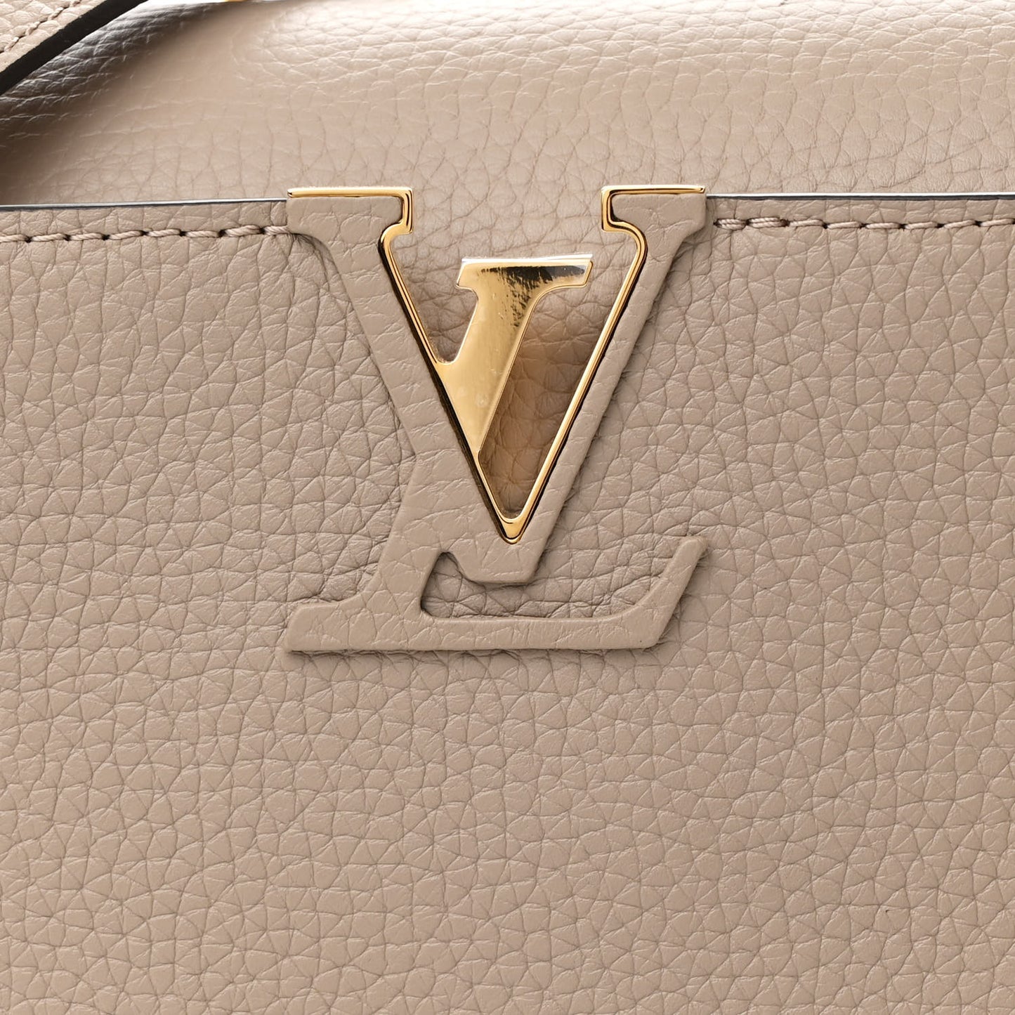 This is an authentic LOUIS VUITTON Taurillon Capucines BB in Galet. This stylish handbag is crafted of beautifully textured taurillon calfskin leather in light taupe. The bag features a reinforced looping rolled leather top handle with gold ring links, an optional shoulder strap, and a leather-lined gold Louis Vuitton logo on the front. The bag opens to a partitioned dark brown leather interior with a zipper pocket.Follow this item for alerts. Louis Vuitton is a registered trademark of Louis Vuitton. FASHIONPHILE is not affiliated with Louis Vuitton.