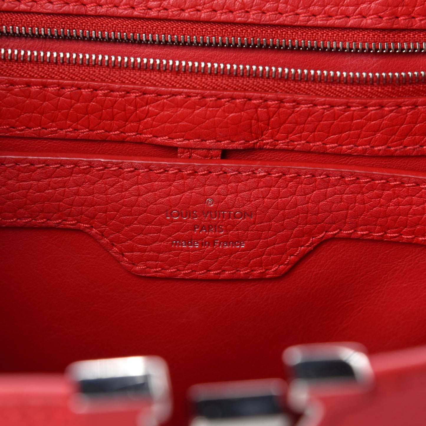 This is an authentic LOUIS VUITTON Taurillon Capucines PM in Rubis. This lovely bag is crafted of textured calfskin leather in red and features a rolled leather top handle with stylized links, crossover flap that inserts behind the prominent polished silver LV, and an optional shoulder strap. The bag opens to a partitioned red leather interior with a zipper pocket. This is the perfect tote for day or evening wear with the luxury and style from Louis Vuitton.Follow this item for alerts. Louis Vuitton is a registered trademark of Louis Vuitton. FASHIONPHILE is not affiliated with Louis Vuitton.