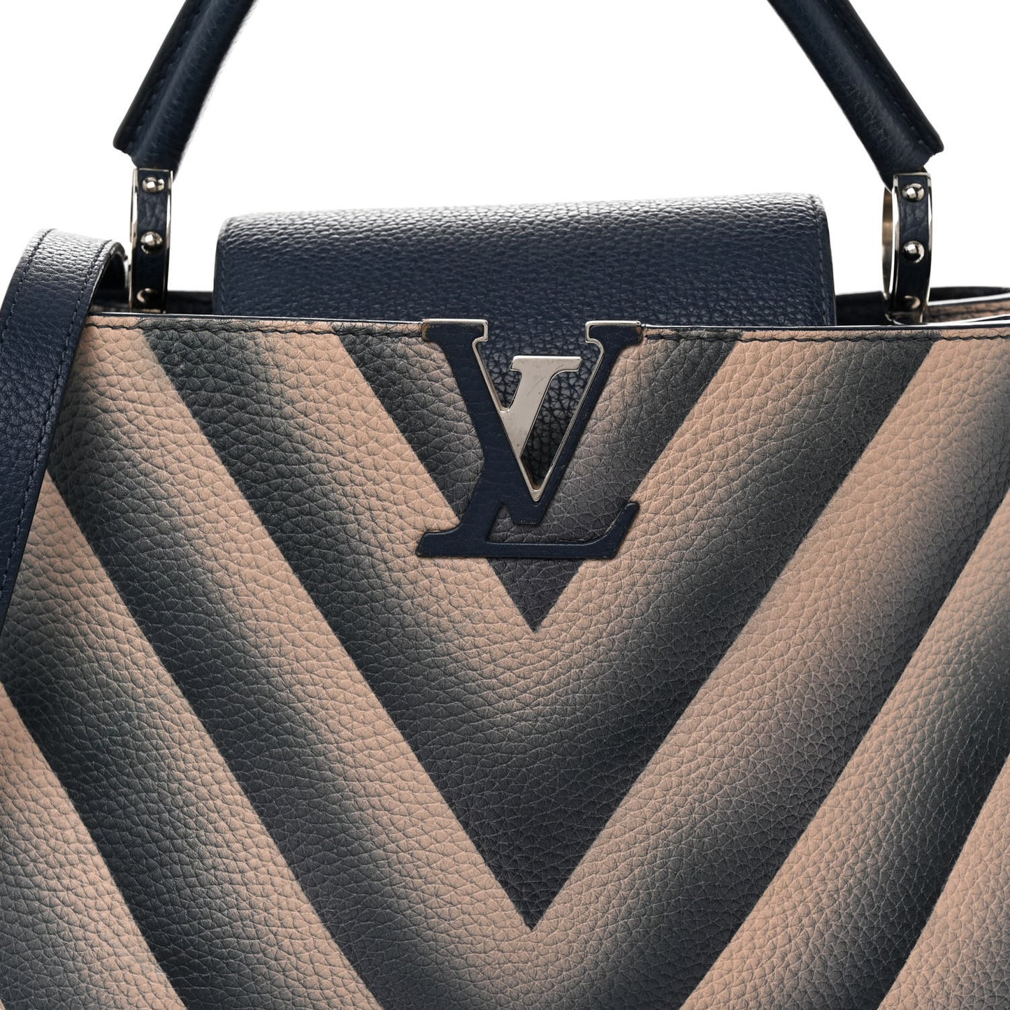 This is an authentic LOUIS VUITTON Taurillon Chevron Capucines PM in Navy. This lovely bag is crafted of textured calfskin leather with a printed dark blue on-beige chevron pattern. The handbag features a dark blue rolled leather top handle with stylized links, a matching leather crossover flap that inserts behind the prominent polished silver LV, and an optional leather shoulder strap. The bag opens to a partitioned dark blue fabric interior with a zipper pocket.Follow this item for alerts. Louis Vuitton is a registered trademark of Louis Vuitton. FASHIONPHILE is not affiliated with Louis Vuitton.