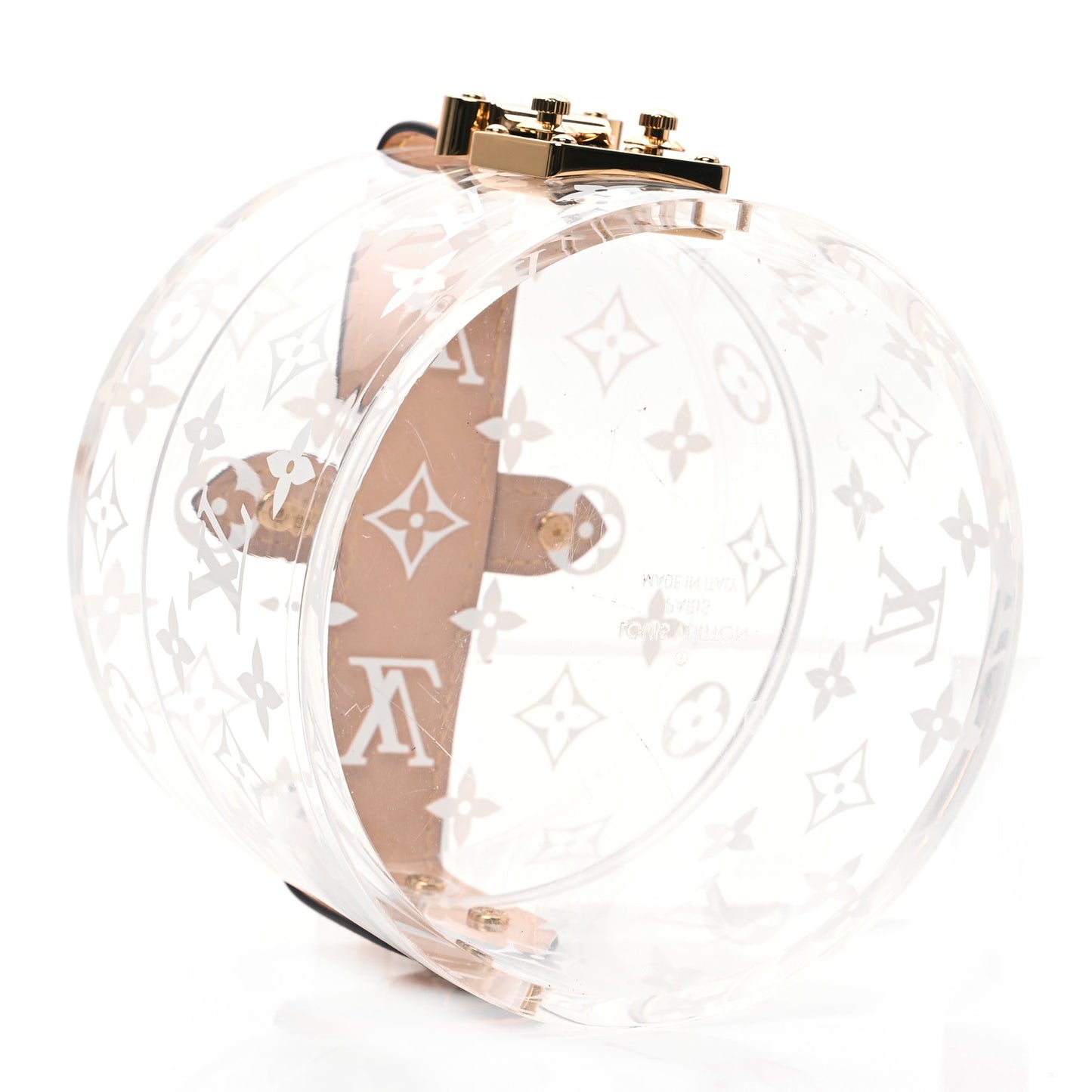 This is an authentic LOUIS VUITTON Transparent Plexiglass Box Scott. This jewelry box is crafted of translucent resin with Louis Vuitton's signature monogram print in white, with a gleaming brass lock and vachetta cowhide leather strap.