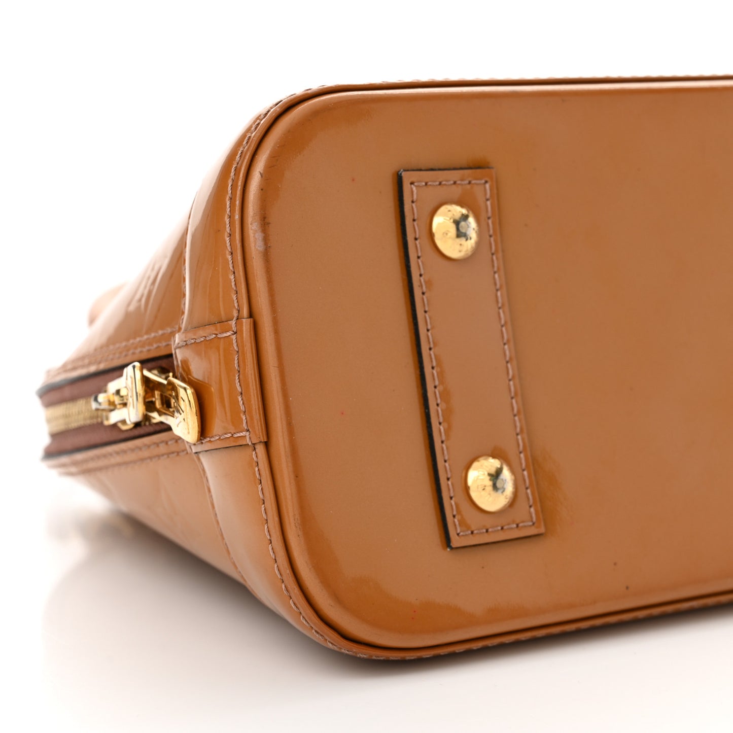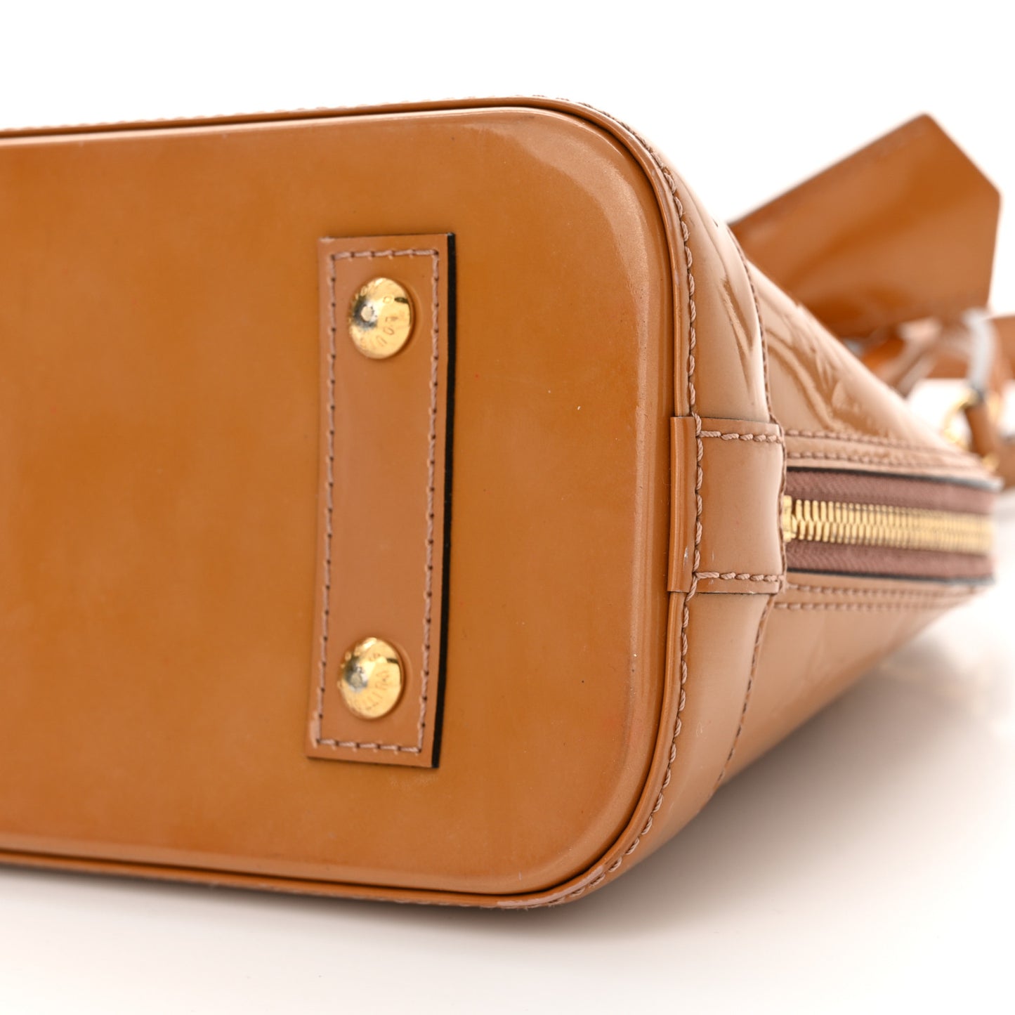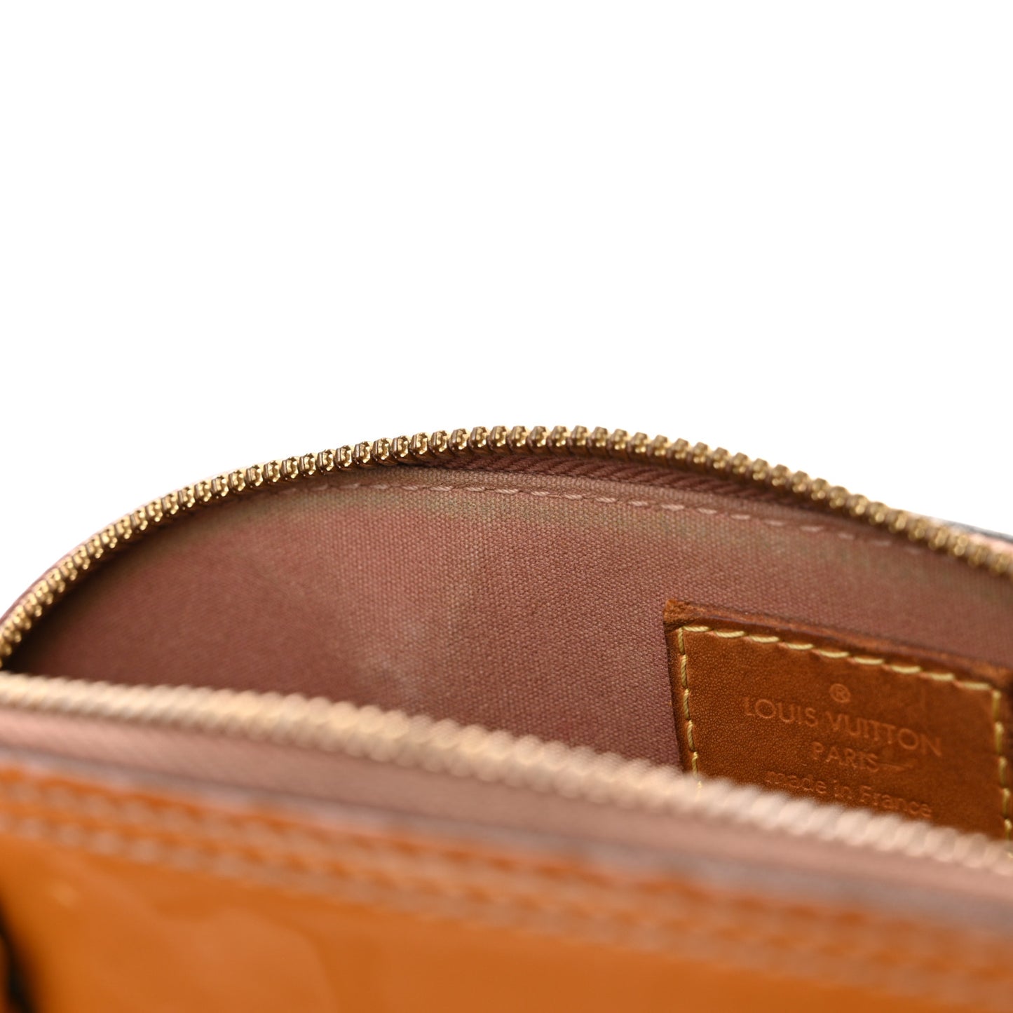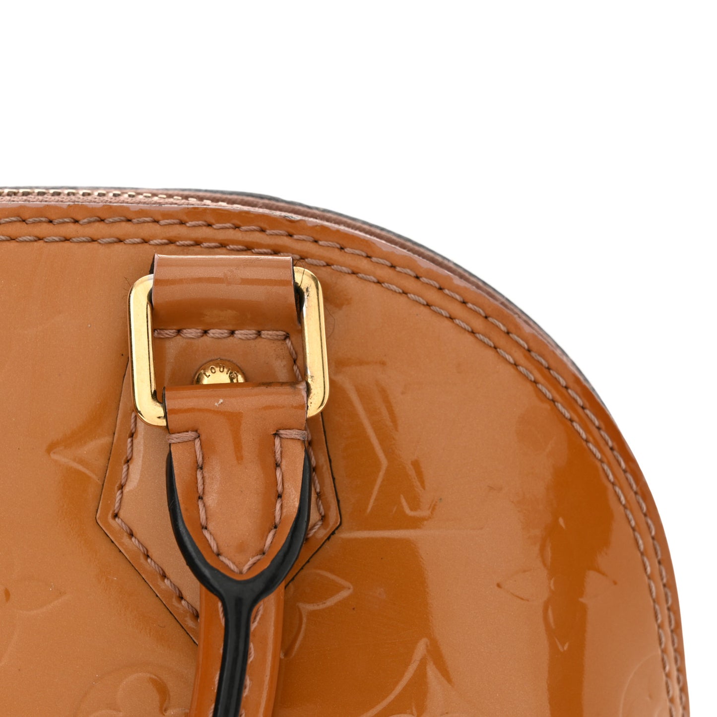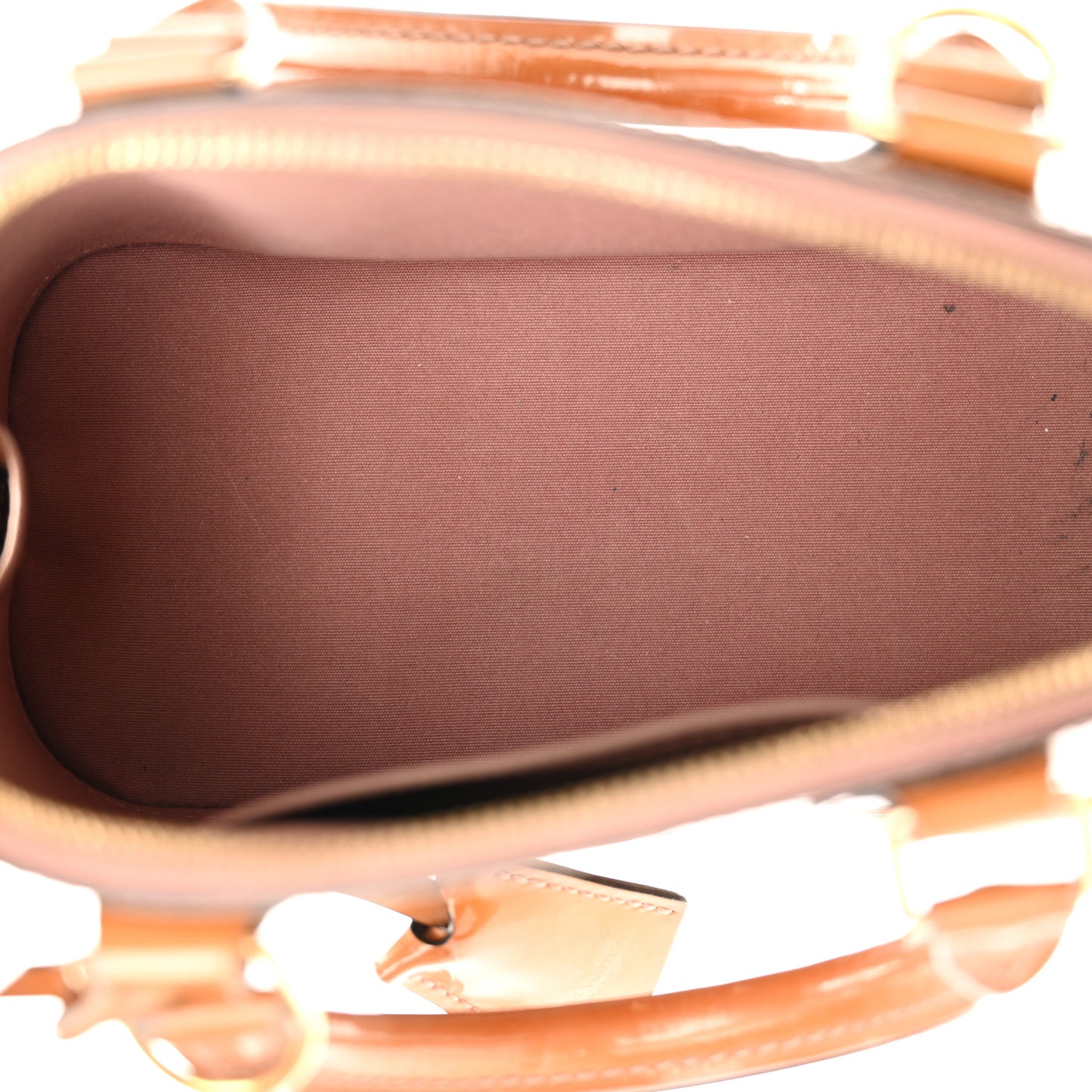This is an authentic LOUIS VUITTON Vernis Alma BB in Rose Velours. This is a chic small Alma that is finely crafted of Louis Vuitton monogram embossed vernis patent leather in dark beige. The bag features rolled leather top handles and brass hardware including links and a hanging clochette. The wrap around zippers open to a fabric interior with a patch pocket.Follow this item for alerts. Louis Vuitton is a registered trademark of Louis Vuitton. FASHIONPHILE is not affiliated with Louis Vuitton.