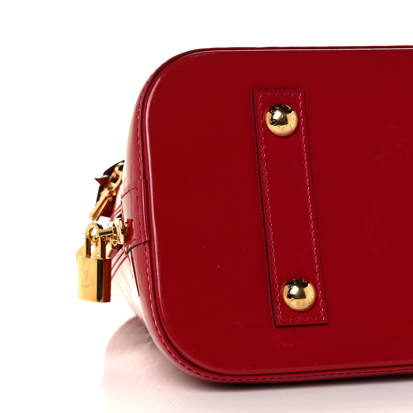 This is an authentic LOUIS VUITTON Vernis Alma PM in Rose Indien. This stunning bowler style tote is crafted of Louis Vuitton monogram embossed Vernis patent leather in dark pink. It features patent leather rolled top handles, smooth patent leather trim on the base, and bottom trim with gold hardware including zippers.Follow this item for alerts. Louis Vuitton is a registered trademark of Louis Vuitton. FASHIONPHILE is not affiliated with Louis Vuitton.