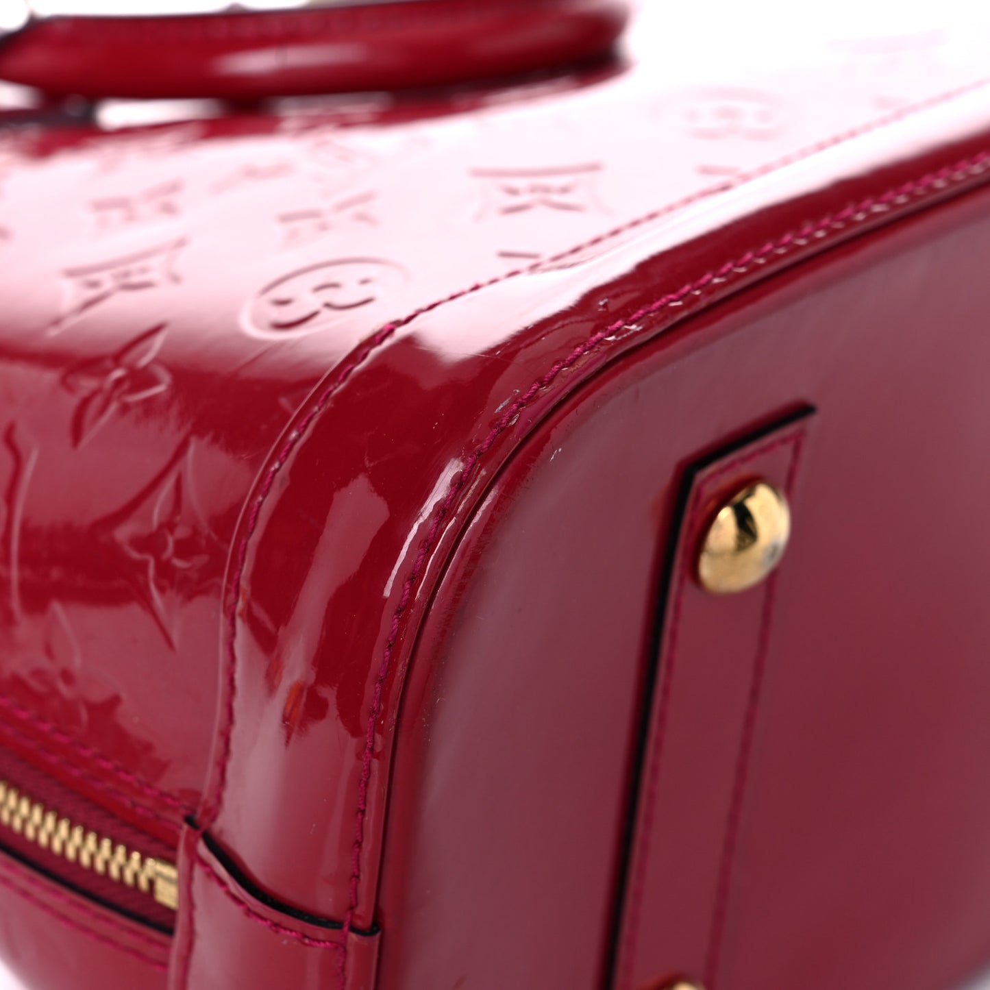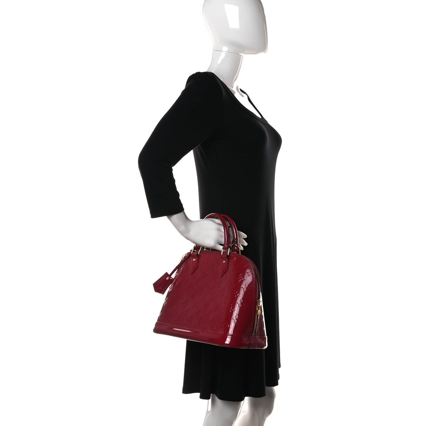 This is an authentic LOUIS VUITTON Vernis Alma PM in Rose Indien. This stunning bowler style tote is crafted of Louis Vuitton monogram embossed Vernis patent leather in dark pink. It features patent leather rolled top handles, smooth patent leather trim on the base, and bottom trim with gold hardware including zippers. This opens to a matching fabric interior with flat pockets.Follow this item for alerts. Louis Vuitton is a registered trademark of Louis Vuitton. FASHIONPHILE is not affiliated with Louis Vuitton.