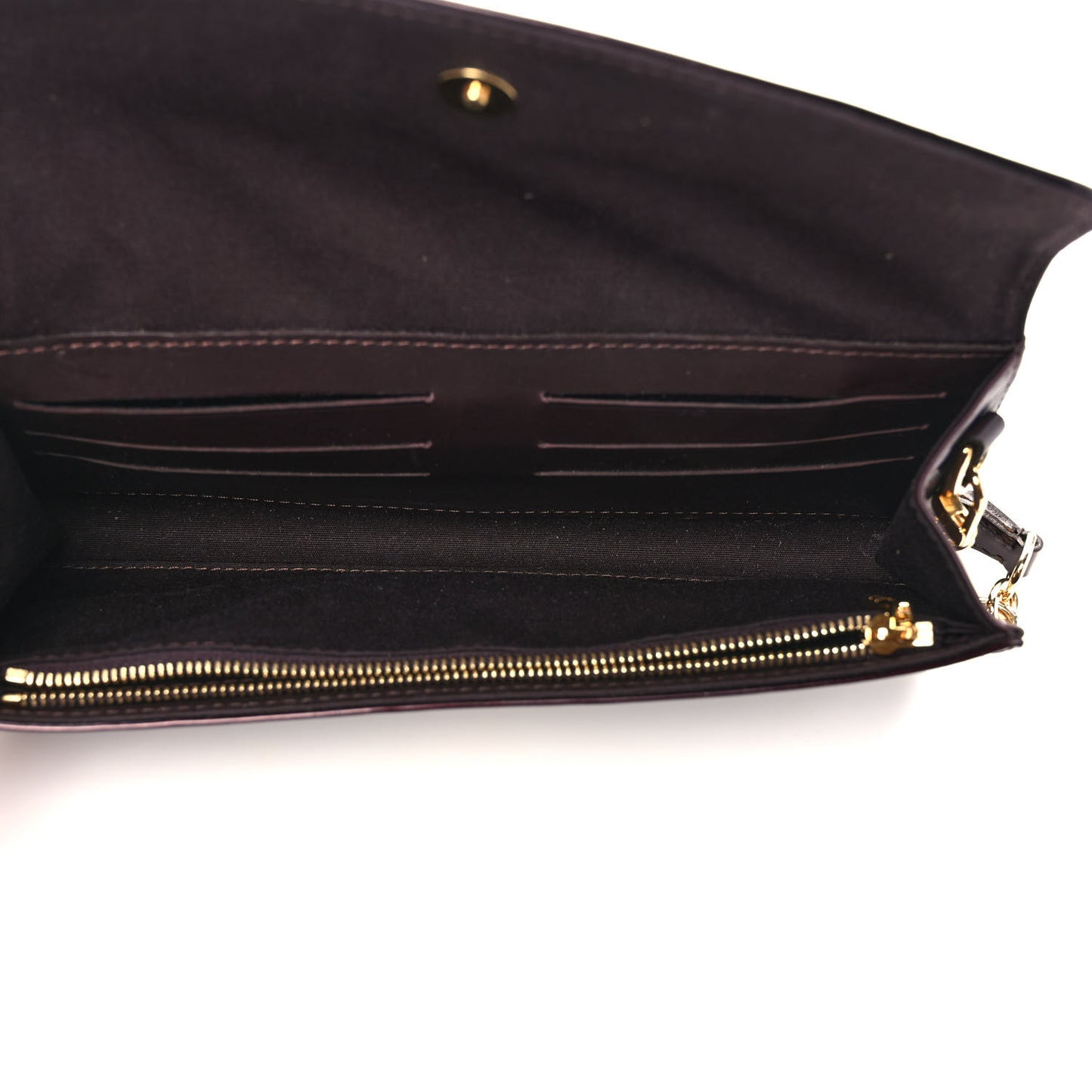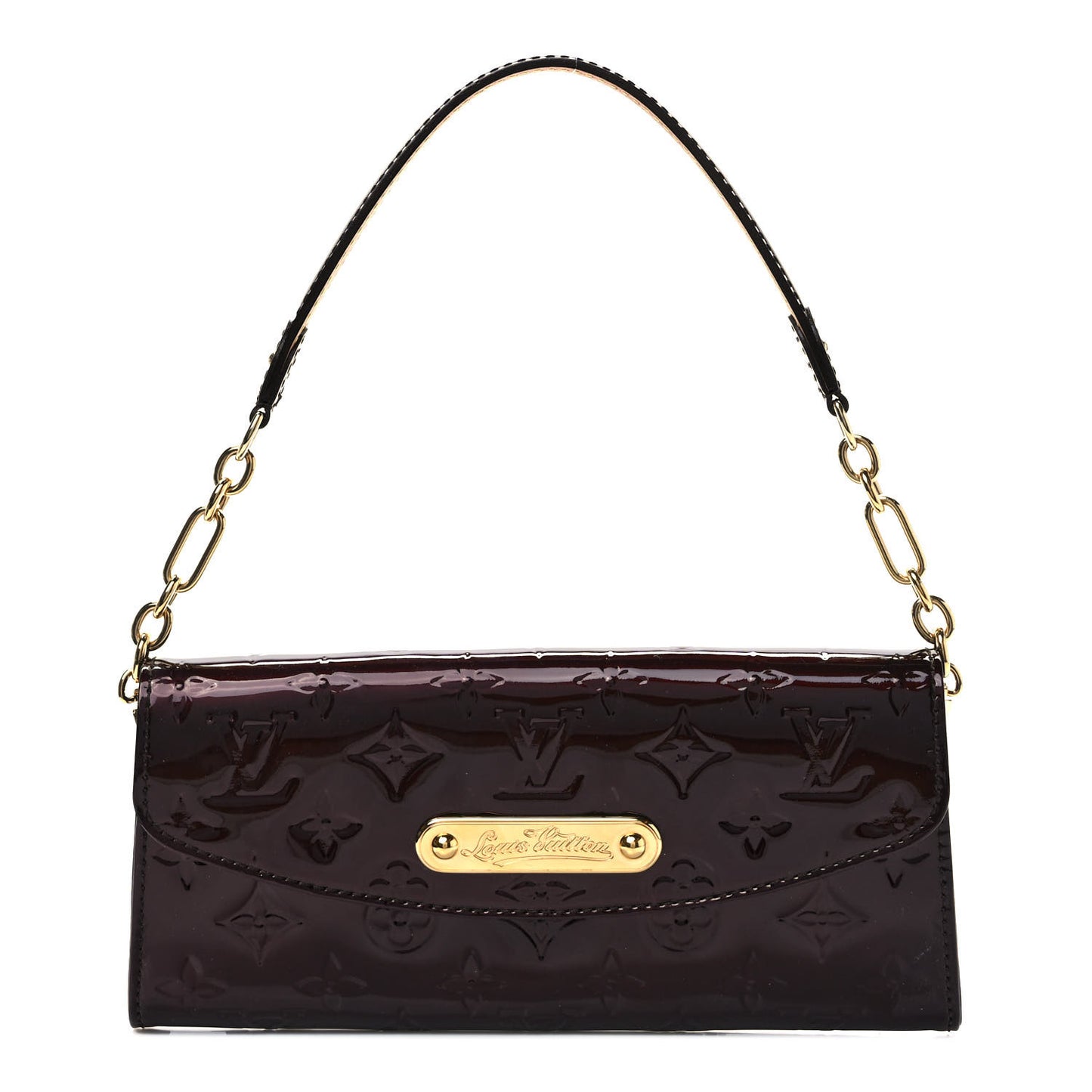 This is an authentic LOUIS VUITTON Vernis Sunset Boulevard in Amarante. This stylish handbag is crafted of Louis Vuitton monogram embossed patent leather in a deep purple. The shoulder bag features a front facing flap with a Louis Vuitton polished gold plate and an optional gold link chain. This petite wallet opens to a matching leather and fabric interior with a card slot panel and zipper compartment.