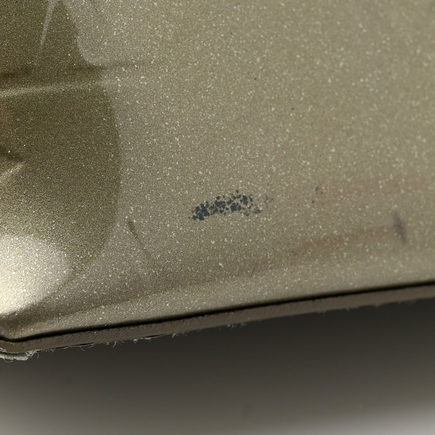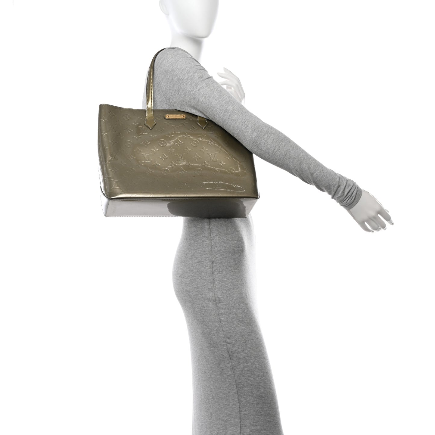 This is an authentic LOUIS VUITTON Vernis Wilshire MM in Gris Art Deco. This stunning tote is crafted of Louis Vuitton monogram embossed vernis patent leather in a grey green. The bag features smooth strap top handles, gold hardware, and a smooth base. The top is open to a gray fabric interior with zipper and patch pockets.Follow this item for alerts. Louis Vuitton is a registered trademark of Louis Vuitton. FASHIONPHILE is not affiliated with Louis Vuitton.