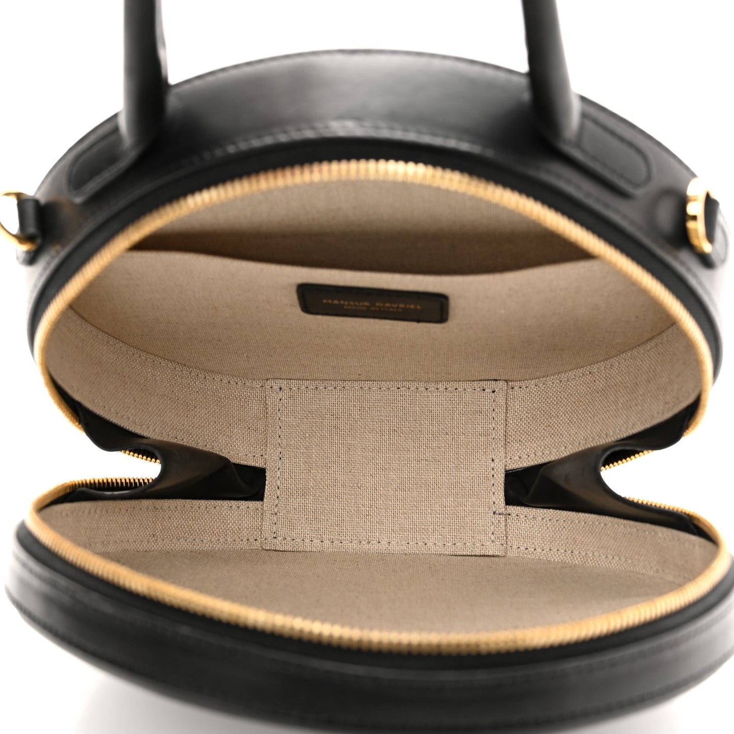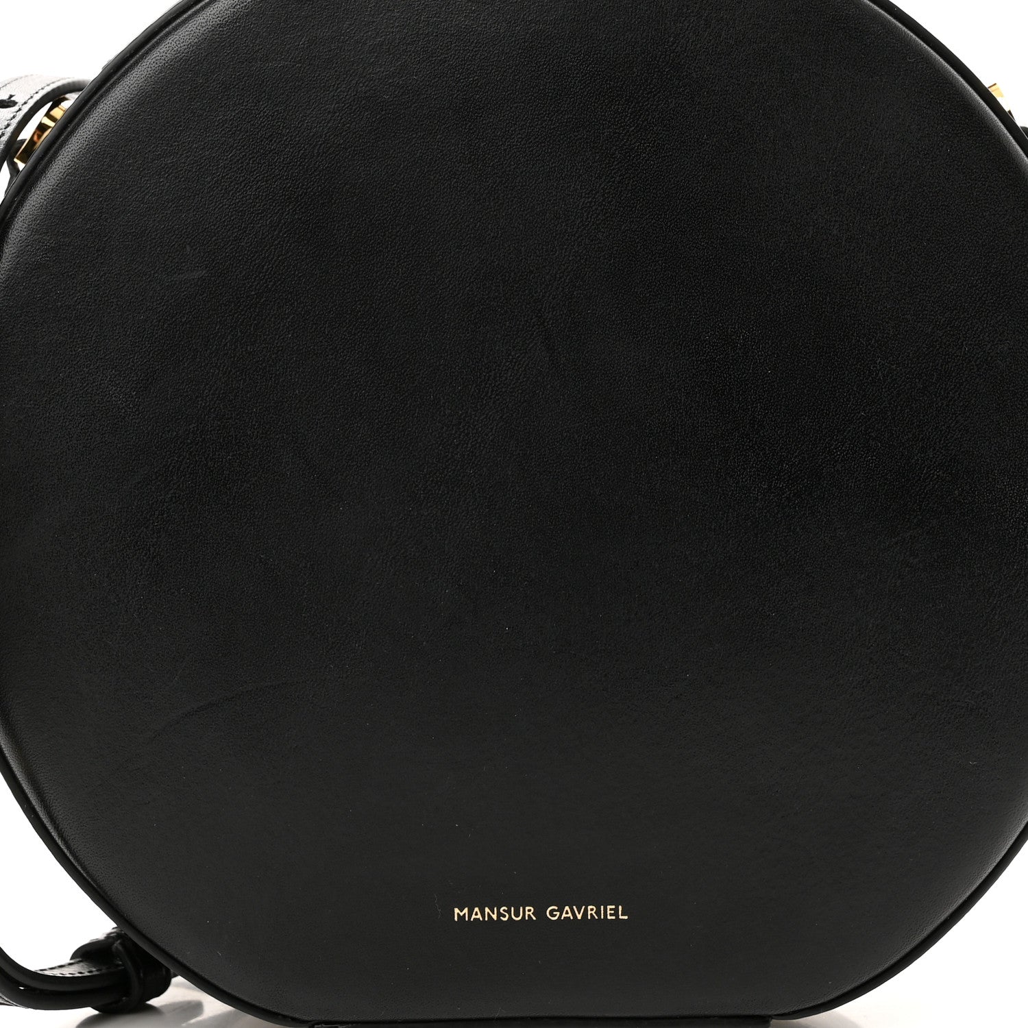 This is an authentic MANSUR GAVRIEL Calfskin Circle Crossbody Bag in Black. This circle-shaped bag is crafted of Italian vegetable tanned calfskin in black. The bag features a rolled top handle and an optional shoulder strap with brass hardware. The wrap-around zipper opens to a linen canvas interior with a patch pocket.Follow this item for alerts. Mansur Gavriel is a registered trademark of Mansur Gavriel. FASHIONPHILE is not affiliated with Mansur Gavriel.