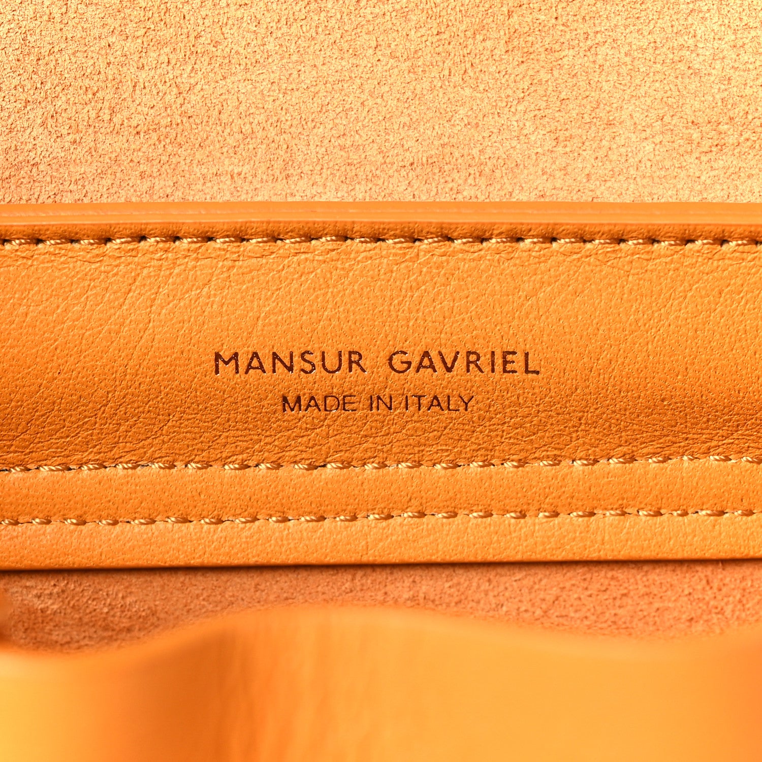 This is an authentic MANSUR GAVRIEL Calfskin Mini Soft Lady Bag in Mango. This elegant shoulder bag is crafted of calfskin leather. The shoulder bag features a matching leather top handle, and an optional shoulder strap with gold hardware. The top flap opens to a matching leather interior.Follow this item for alerts. Mansur Gavriel is a registered trademark of Mansur Gavriel. FASHIONPHILE is not affiliated with Mansur Gavriel.