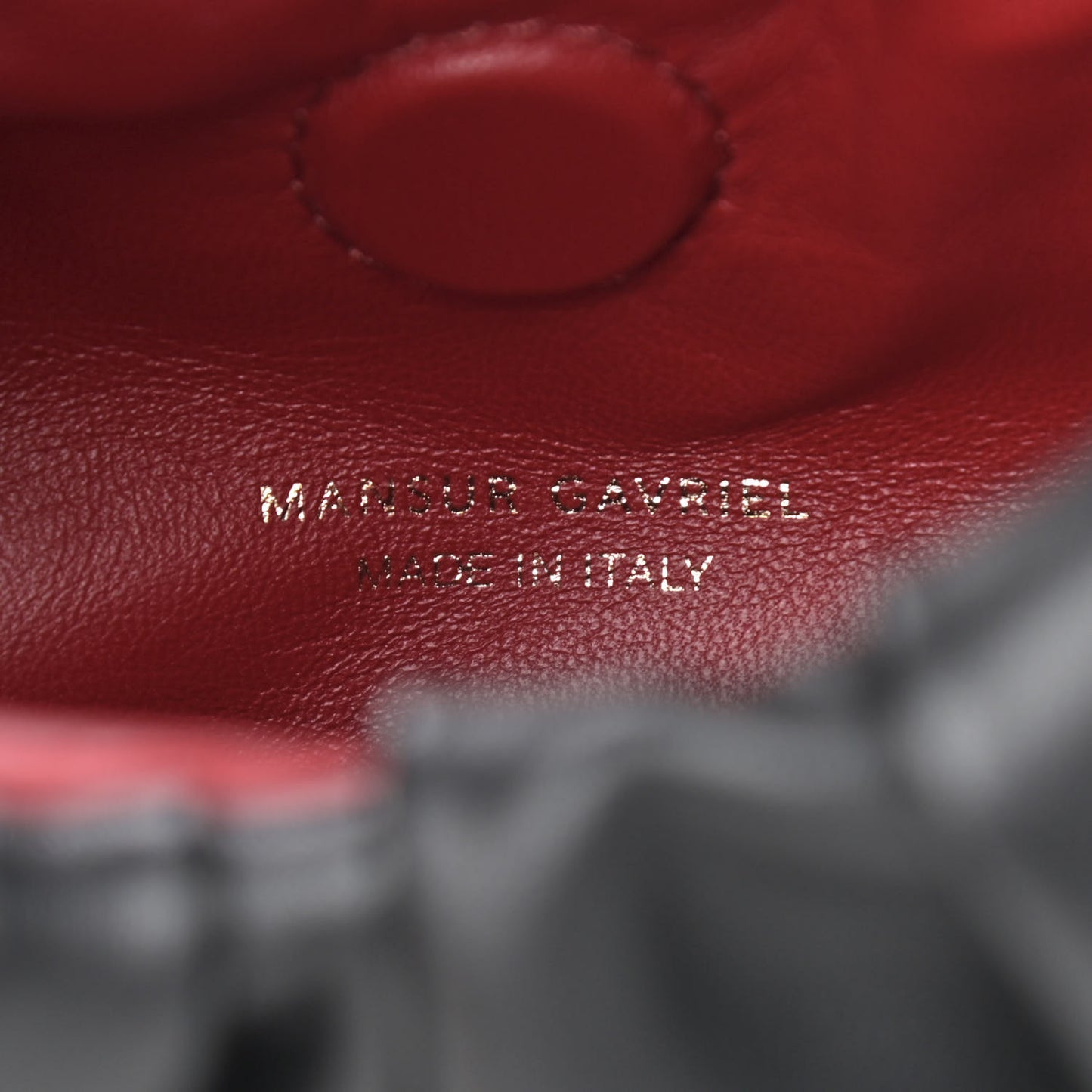 This is an authentic MANSUR GAVRIEL Lambskin Mini Scrunchie Bag in Black. This stylish bag is crafted of smooth lambskin leather in black. The bag has a ruched texture throughout and a magnetic top opening that opens to a red leather interior.Follow this item for alerts. Mansur Gavriel is a registered trademark of Mansur Gavriel. FASHIONPHILE is not affiliated with Mansur Gavriel.