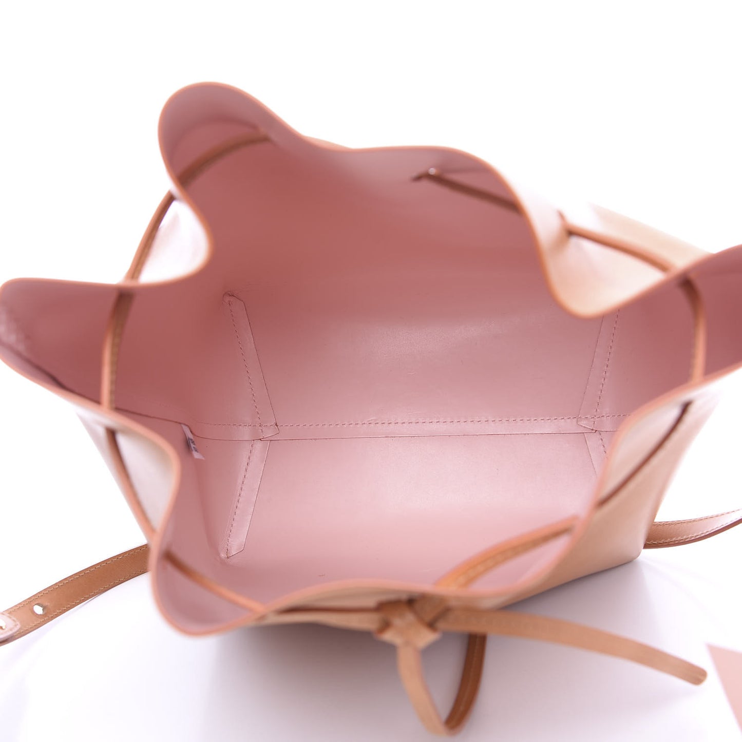 This is an authentic MANSUR GAVRIEL Vegetable Tanned Calfskin Bucket Bag in Cammello and Rosa. This classic bucket shape bag is crafted of rich vegetable tanned calfskin leather in a light brown. The bag features a drawstring top, a adjustable shoulder strap, and polished gold hardware. The top opens to a spacious pink interior. This is an excellent classic for everyday, with the classic chic of MANSUR GAVRIEL!
