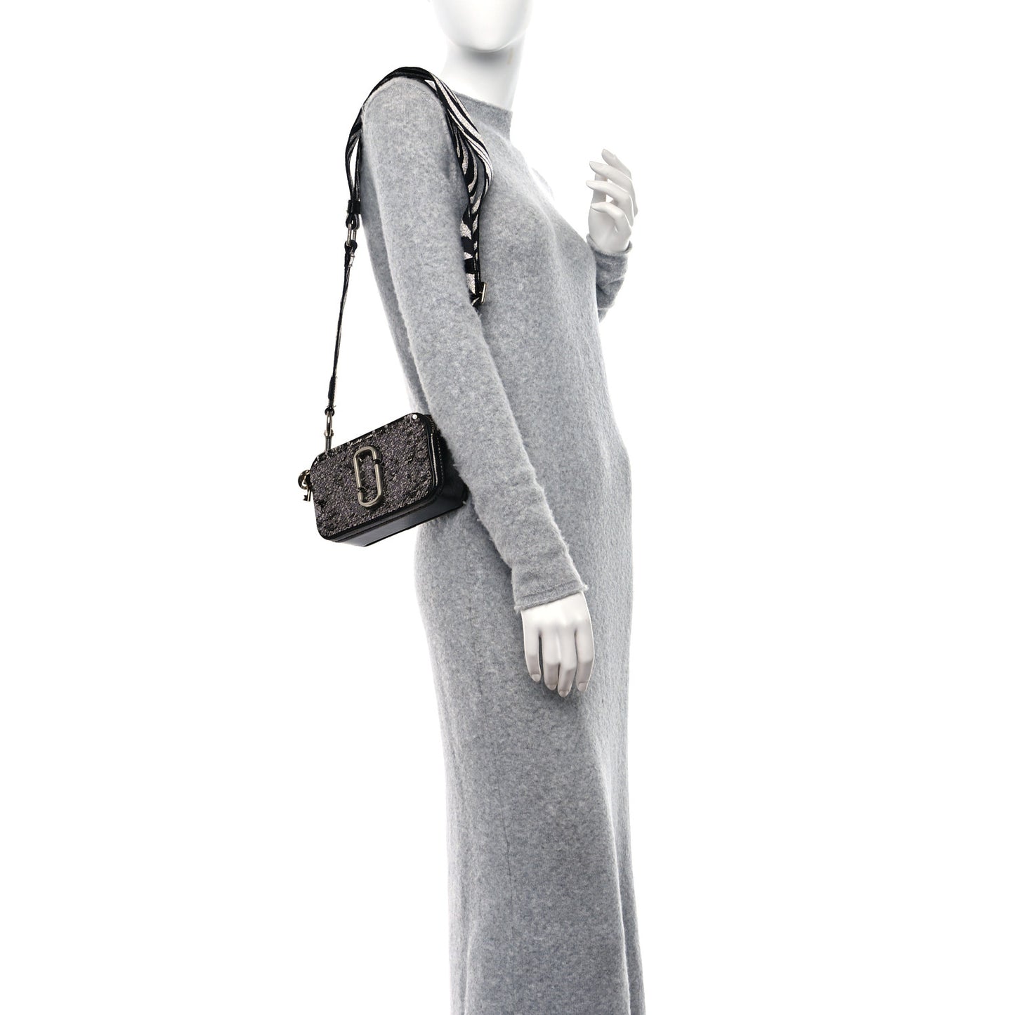 This is an authentic MARC JACOBS Calfskin Sequin Snapshot Camera Bag in Black. This stylish crossbody features metallic sequins on the front panel, silver hardware, an adjustable black and silver canvas shoulder strap. The top zippers each open to a black fabric interior.Follow this item for alerts. Marc Jacobs is a registered trademark of Marc Jacobs. FASHIONPHILE is not affiliated with Marc Jacobs.