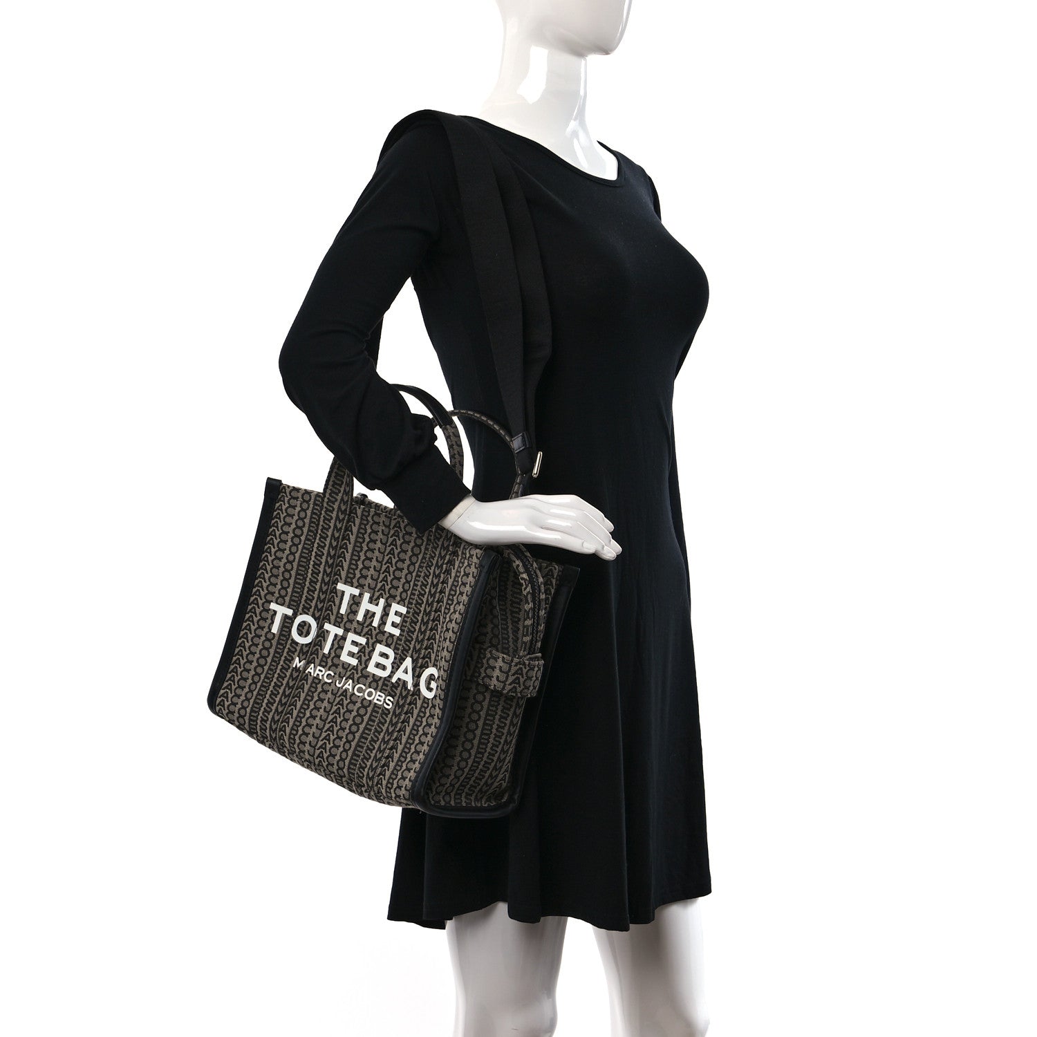 This is an authentic MARC JACOBS Cotton Jacquard Monogram Medium The Traveler Tote Bag in Beige and Multicolor. This shoulder bag is crafted of Marc Jacobs logo jacquard canvas with black leather trim. It features a printed white logo, matching rolled canvas straps, and an optional adjustable black canvas shoulder strap with silver hardware. The overextending zipper top opens to a spacious black fabric interior with a hanging zipper and flat pockets.Follow this item for alerts. Marc Jacobs is a registered trademark of Marc Jacobs. FASHIONPHILE is not affiliated with Marc Jacobs.