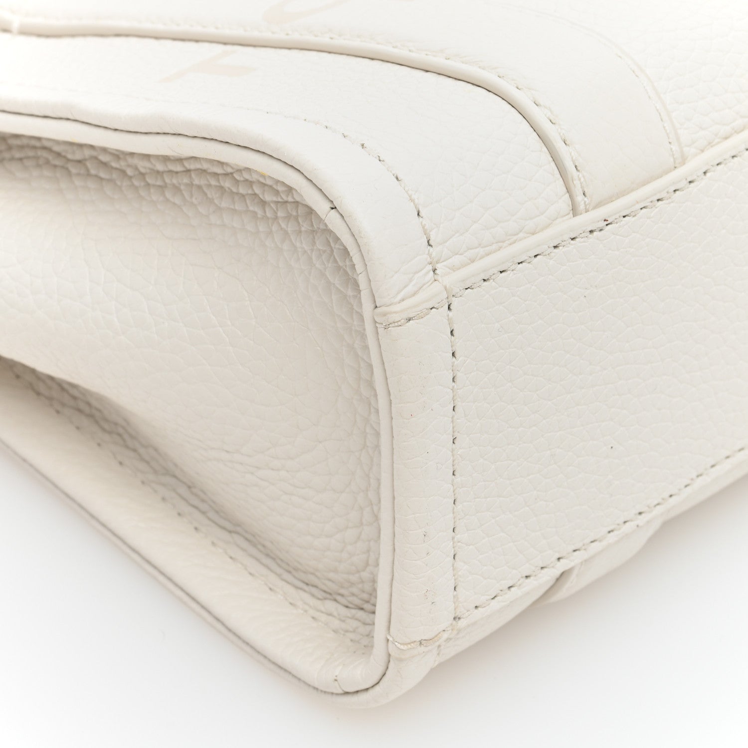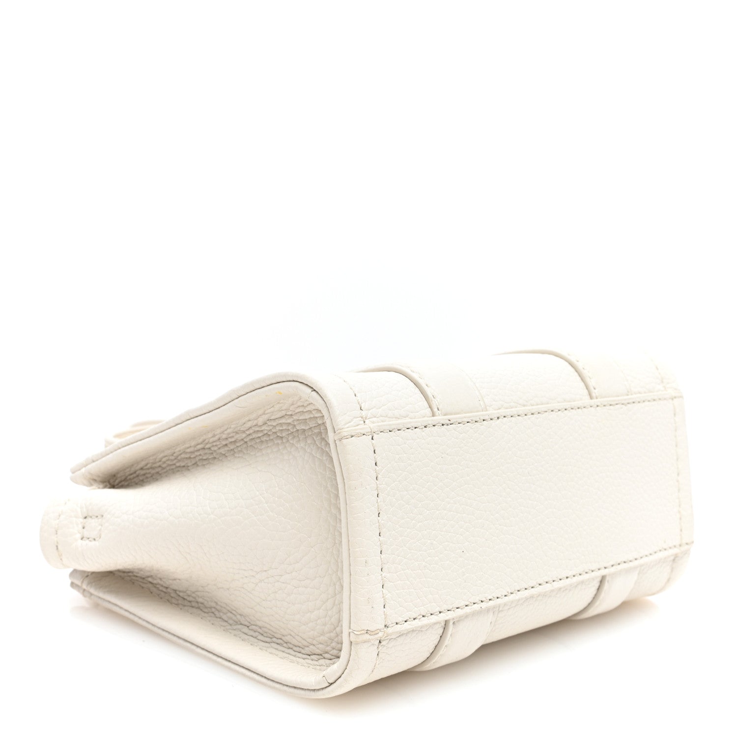 This is an authentic MARC JACOBS Grained Calfskin Micro The Tote Bag in Cotton and Silver. This petite tote is crafted with supple leather in off-white. The bag features top handles, an optional adjustable shoulder strap, and an embossed print on the front. The top opens to a contrasting leather and canvas interior.Follow this item for alerts. Marc Jacobs is a registered trademark of Marc Jacobs. FASHIONPHILE is not affiliated with Marc Jacobs.