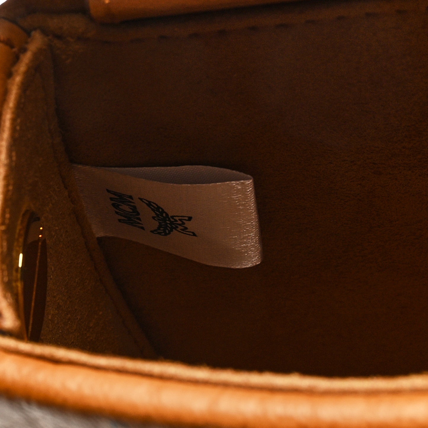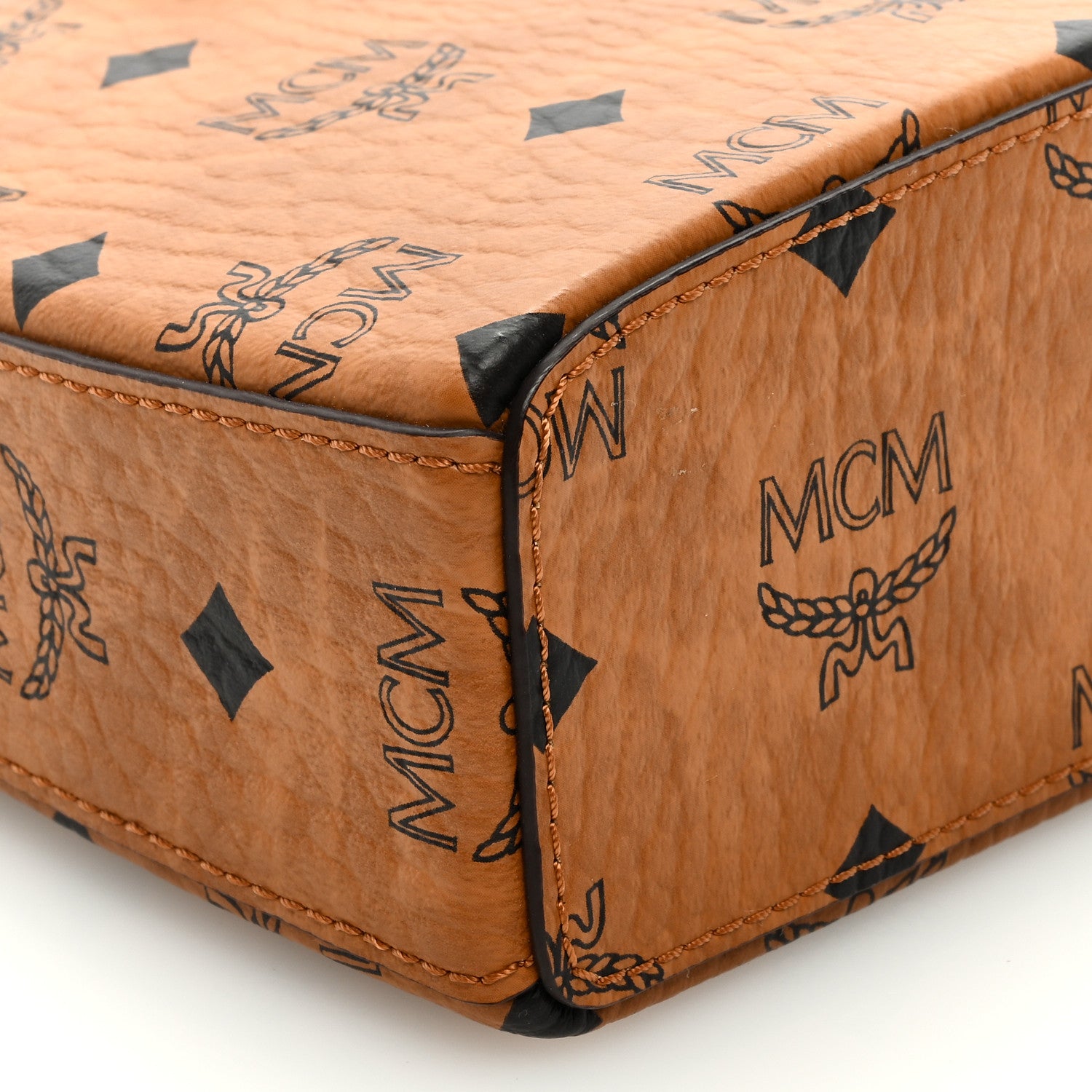 This is an authentic MCM Visetos Stark Pushlock Clutch in Cognac. This petite tote is crafted of brown coated canvas with MCM monogram in black. This bag features a brown leather strap handle, an optional gold chain and leather shoulder strap, and polished gold tone hardware. The push lock opens to a brown fabric interior.Follow this item for alerts. MCM is a registered trademark of MCM. FASHIONPHILE is not affiliated with MCM.