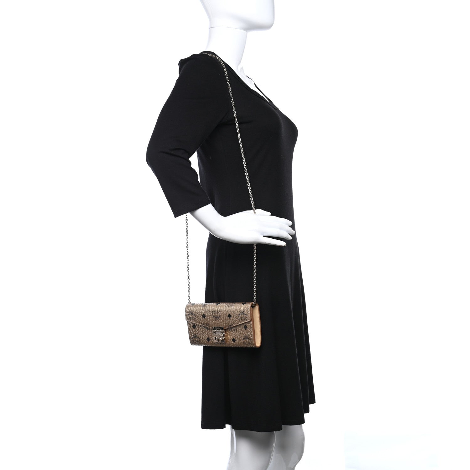 This is an authentic MCM Metallic Visetos Patricia Wallet On Chain in Gold. This wallet is crafted of visetos coated canvas in gold with black MCM monogram design. The wallet features a gold push-lock closure and an optional gold chain shoulder strap. The front flap opens to a gold leather interior with card slots, flat pockets, and a zipper compartment.Follow this item for alerts. MCM is a registered trademark of MCM. FASHIONPHILE is not affiliated with MCM.