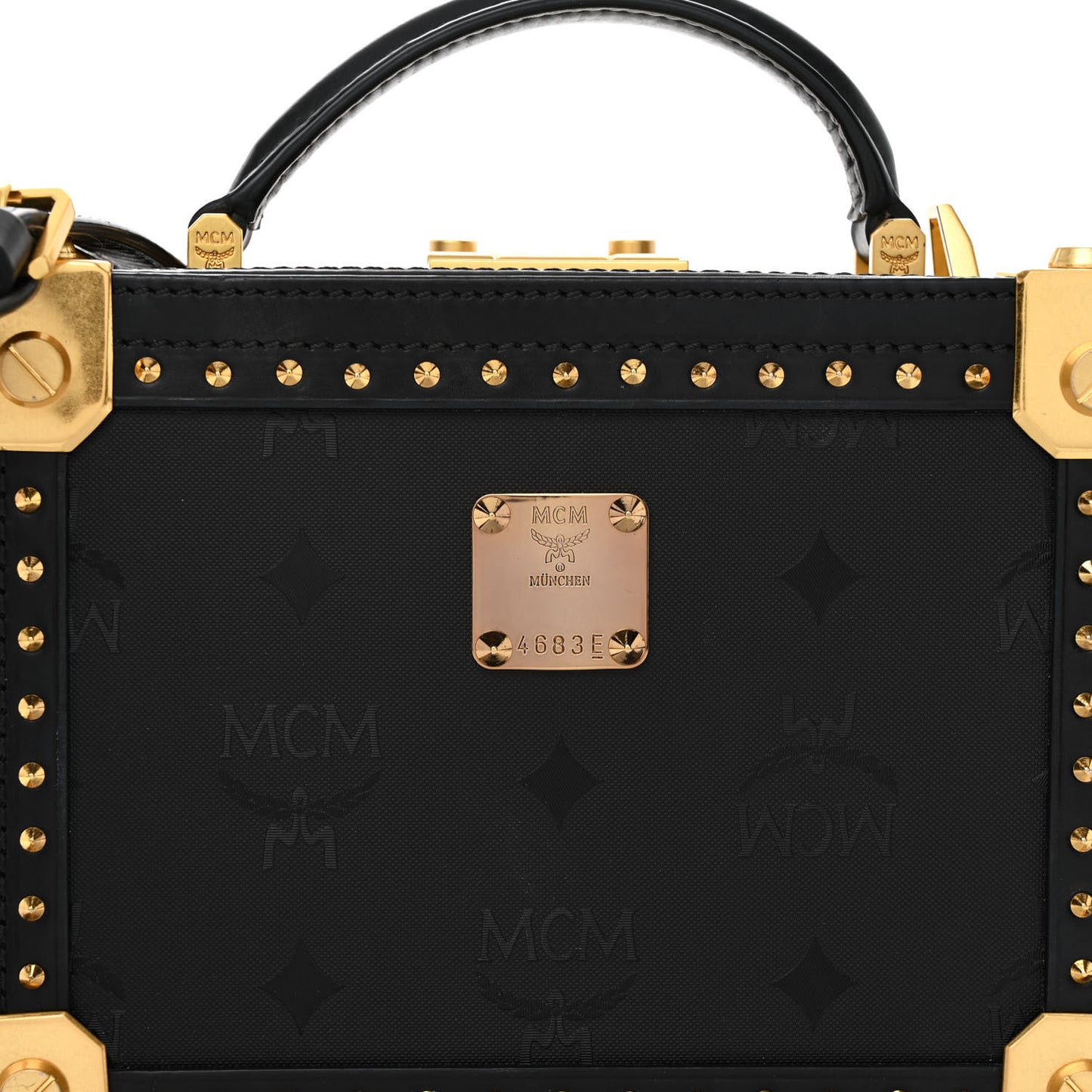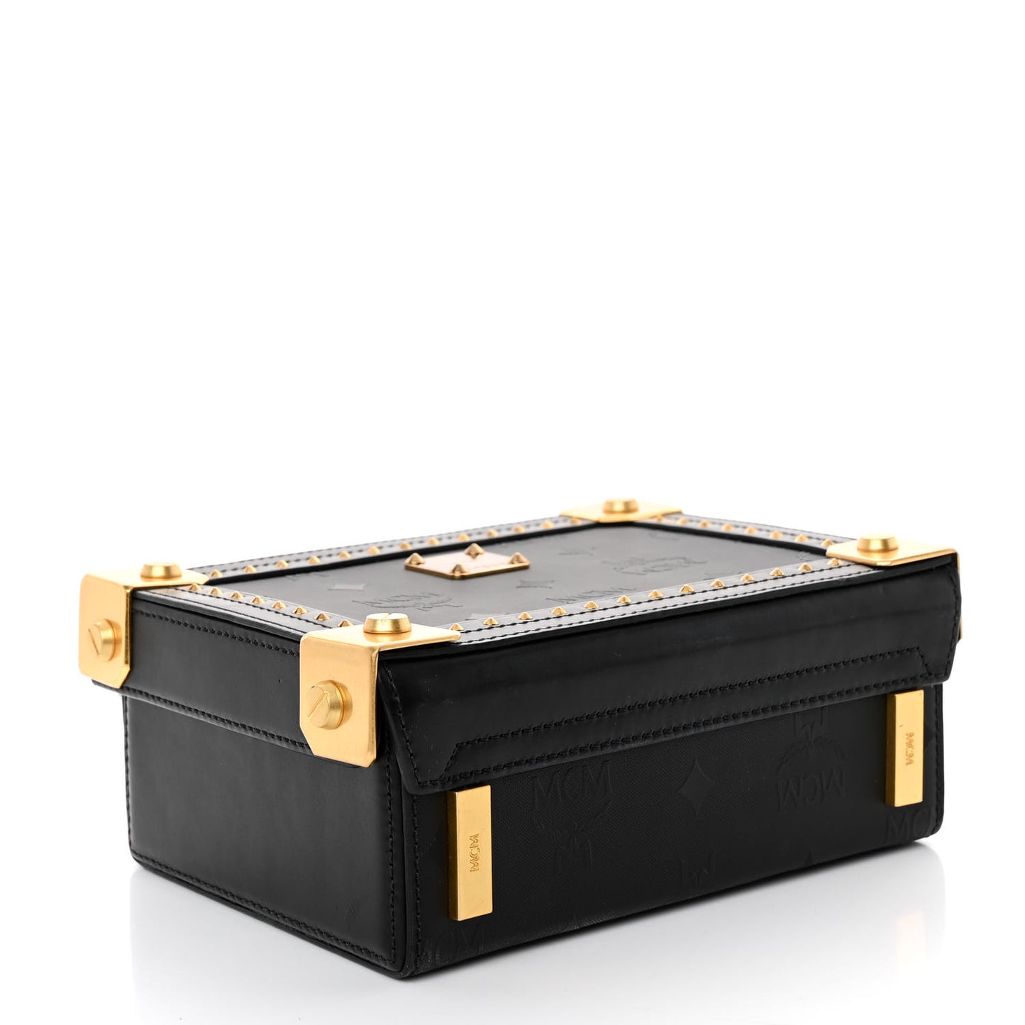 This is an authentic MCM Odeon Calfskin Small Berlin Crossbody in Black. This small Berlin crossbody is crafted of embossed calfskin leather with black leather trim. It features polished gold hardware, a detachable, adjustable shoulder strap and a top handle. The top opens with an MCM slide lock to a partitioned brown suede interior with a pocket and single card slot.Follow this item for alerts. MCM is a registered trademark of MCM. FASHIONPHILE is not affiliated with MCM.