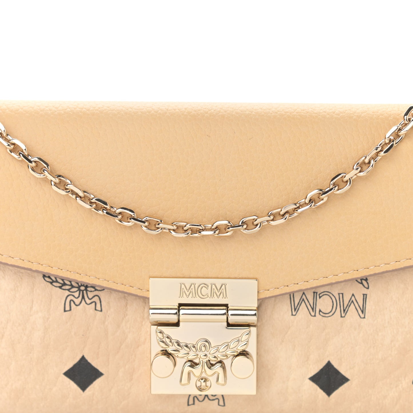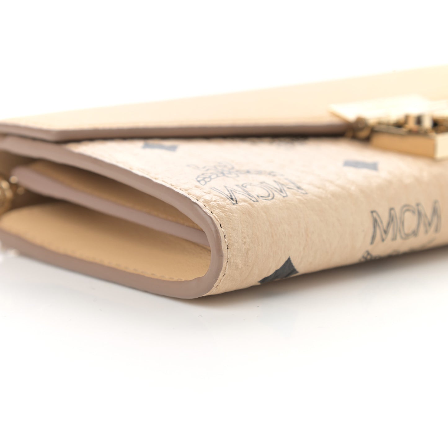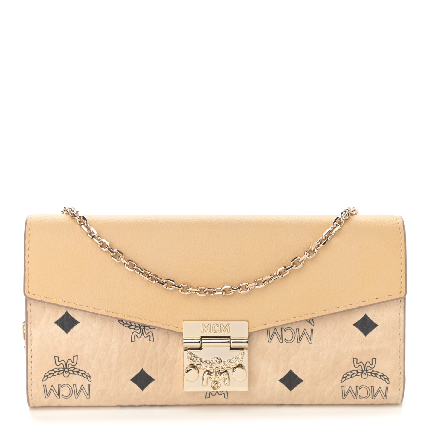 This is an authentic MCM Visetos Calfskin Large Patricia Wallet On Chain in Beige. This wallet on chain is crafted of MCM's signature visetos coated canvas in beige with the MCM monogram with a removable chain shoulder strap. The flap opens to a matching beige leather and fabric interior. Inside the wallet are card slots, and a zipper compartment.Follow this item for alerts. MCM is a registered trademark of MCM. FASHIONPHILE is not affiliated with MCM.