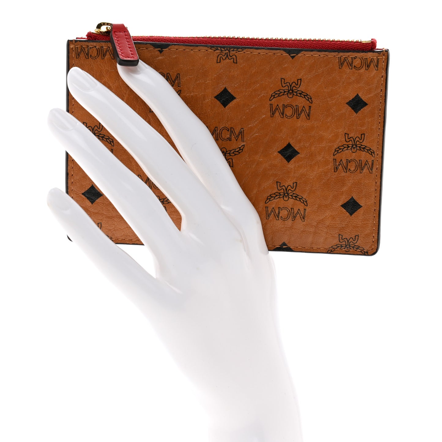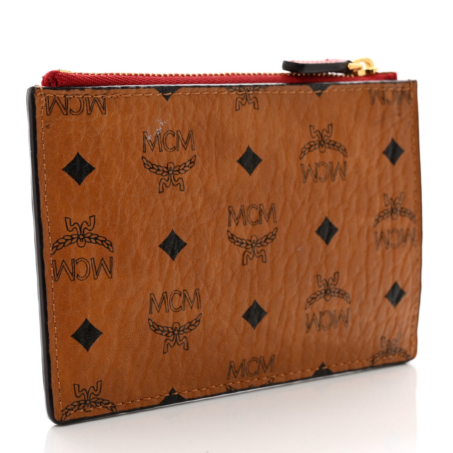 This is an authentic MCM Visetos Key Pouch in Cognac and Red. This pouch is crafted of MCM visetos coated canvas in rich cafe brown with the MCM monogram. The top zipper opens to a matching leather interior and a gold tone key ring.Follow this item for alerts. MCM is a registered trademark of MCM. FASHIONPHILE is not affiliated with MCM.