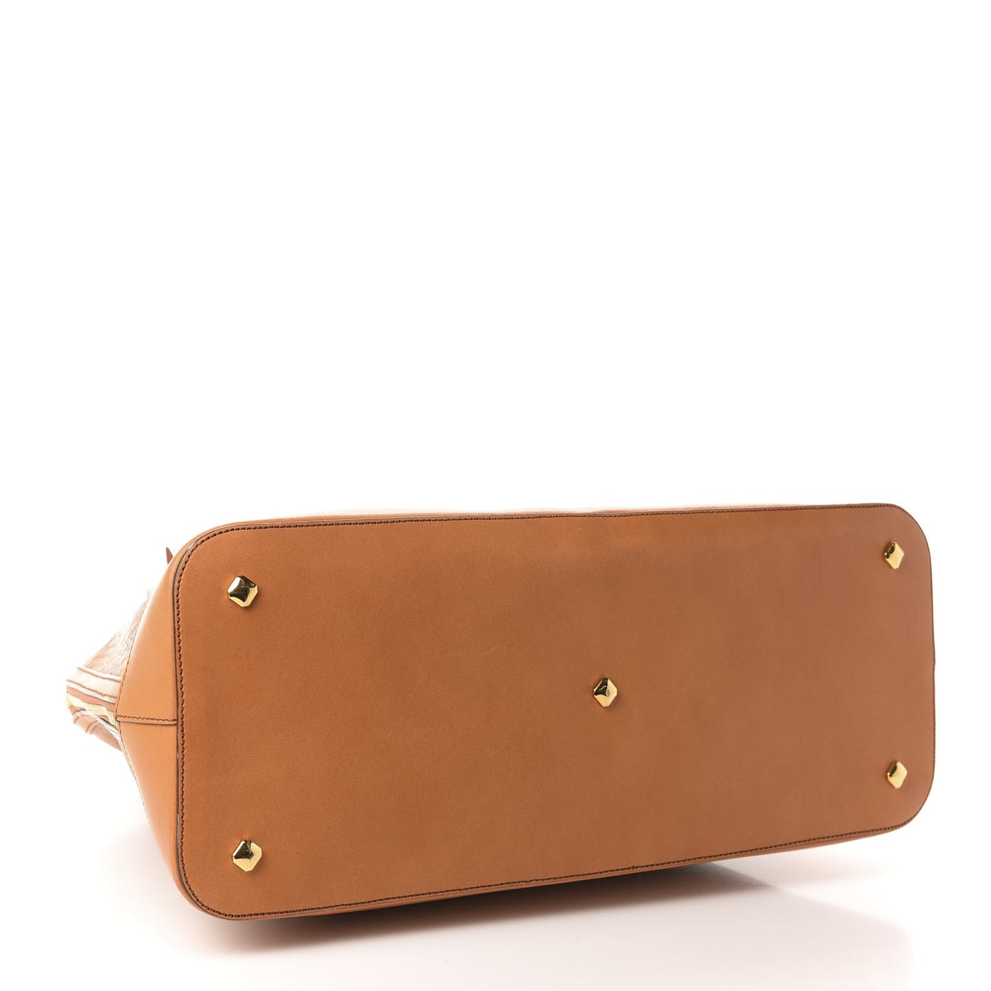 This is an authentic MCM Visetos Large Heritage Bowler Bag in Cognac. This chic handbag is finely crafted of visetos print coated canvas with MCM monogram throughout and smooth leather base. The bag features a leather handle and brass hardware. The top zipper opens to an orange fabric interior with zipper and patched pocket.Follow this item for alerts. MCM is a registered trademark of MCM. FASHIONPHILE is not affiliated with MCM.