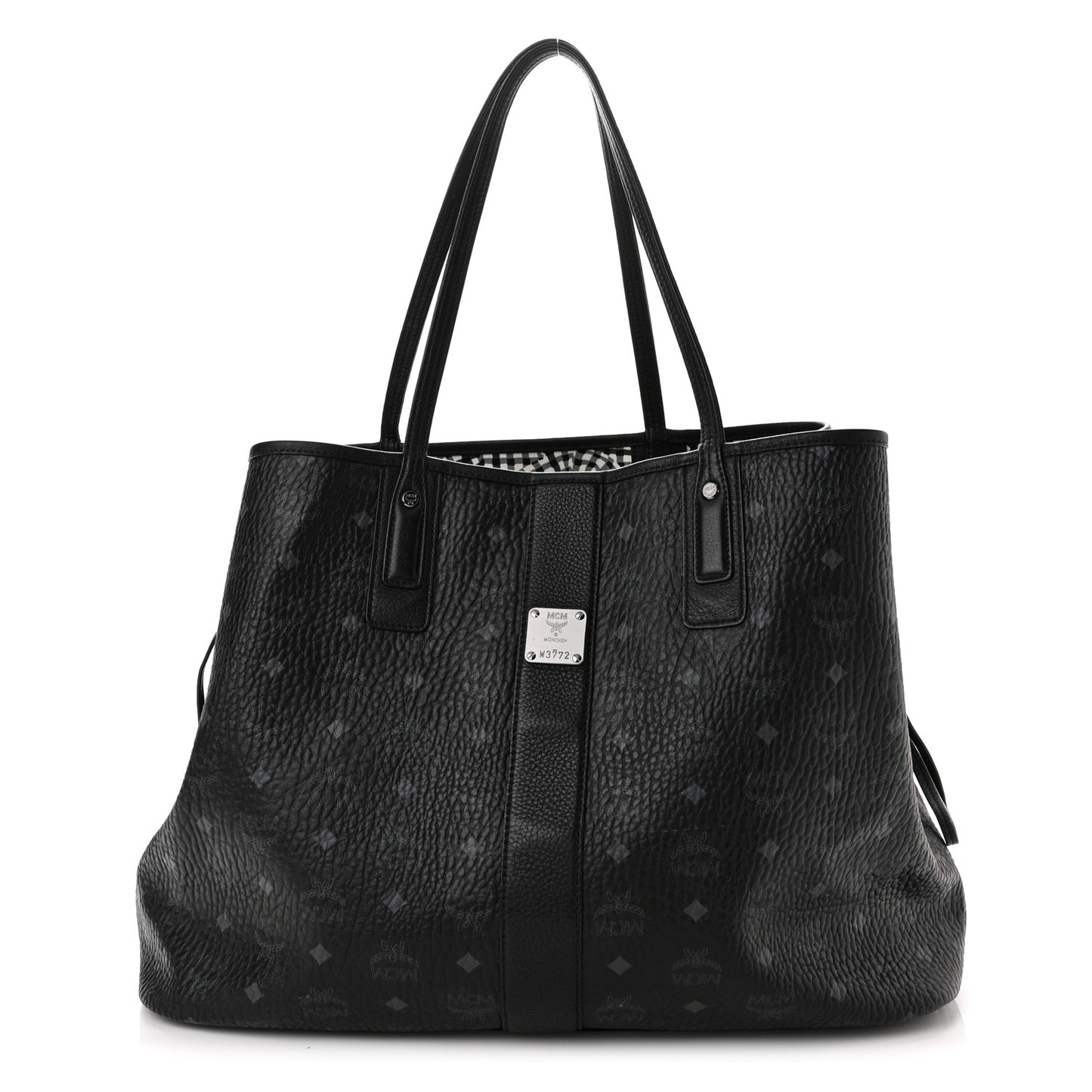 This is an authentic MCM Visetos Large Liz Reversible Shopper Tote in Black. This sophisticated tote is finely crafted of coated canvas in black with the classic grey MCM monogram print and a polished dark silver MCM emblem on the front. The tote features leather top handles and a top that opens to a reversible white and black canvas lining with a prominent black MCM logo.Follow this item for alerts. MCM is a registered trademark of MCM. FASHIONPHILE is not affiliated with MCM.