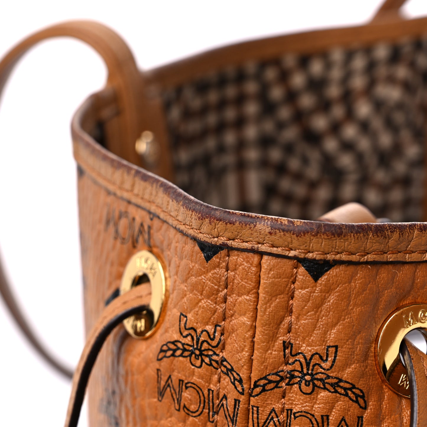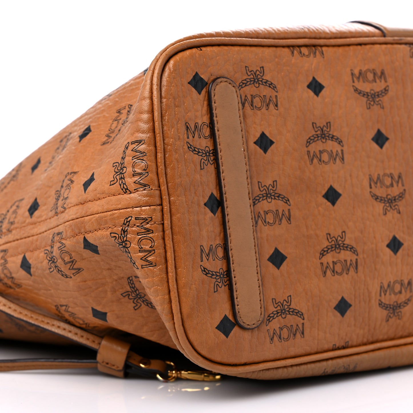 This is an authentic MCM Visetos Medium Liz Reversible Shopper Tote in Cognac. This sophisticated tote is finely crafted of coated canvas in brown, with the classic black MCM monogram print, and is reversible to a white and brown checkered canvas lining with a prominent purple MCM logo. The shoulder bag features an open top with leather straps and gold hardware, and a matching pouch.Follow this item for alerts. MCM is a registered trademark of MCM. FASHIONPHILE is not affiliated with MCM.