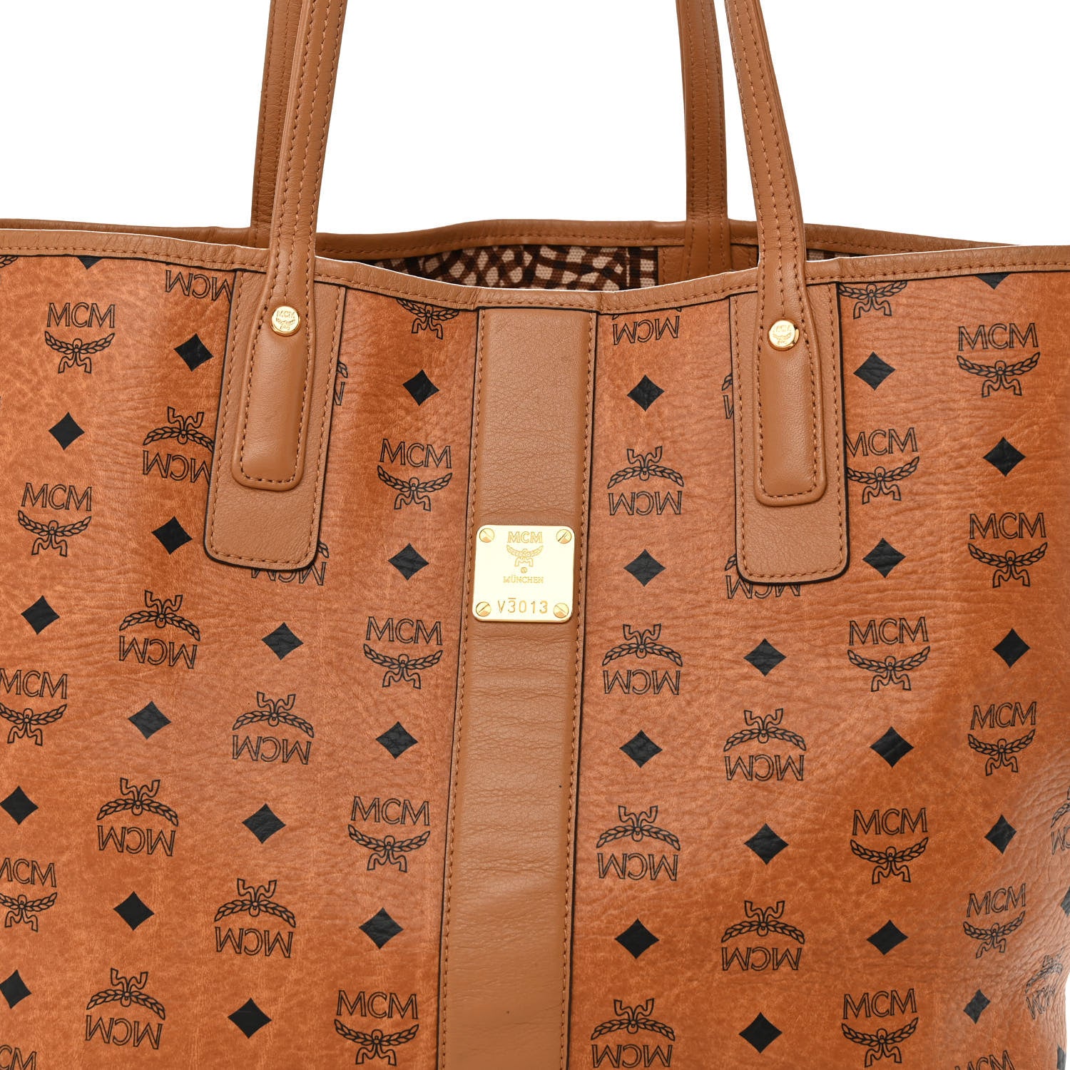 This is an authentic MCM Visetos Medium Liz Reversible Shopper Tote in Cognac. This reversible tote is finely crafted of classic MCM monogram on visetos coated canvas in golden brown. The bag features matching brown leather trim, shoulder straps, and side cinch cords with polished gold hardware. The top is open to a brown checkered canvas fabric interior with a prominent purple MCM logo.Follow this item for alerts. MCM is a registered trademark of MCM. FASHIONPHILE is not affiliated with MCM.