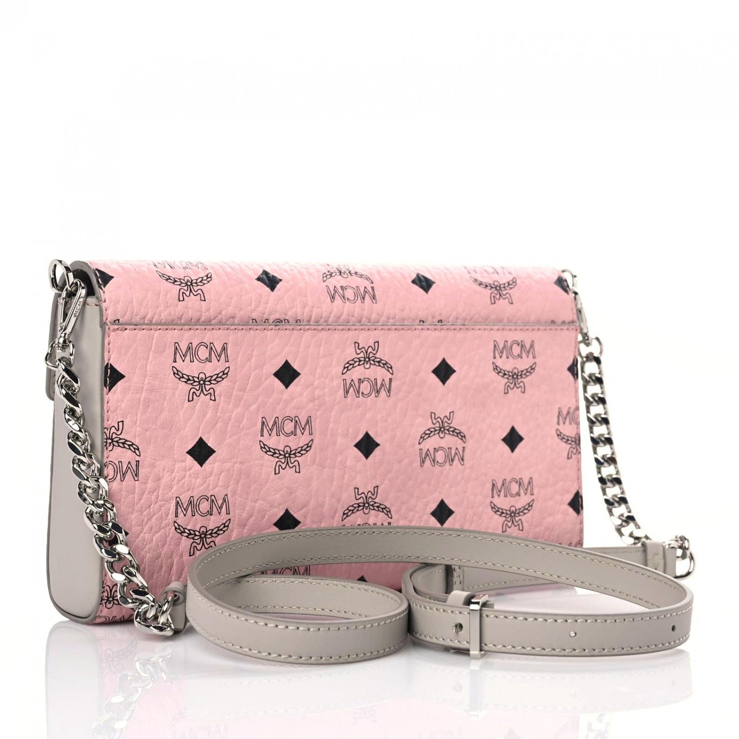 This is an authentic MCM Visetos Medium Millie Crossbody Bag in Soft Pink. This sophisticated crossbody bag is finely crafted of soft pink in calfskin, embossed with black MCM monogram. This bag features a removable long chain strap and silver hardware. The top opens to a khaki fabric interior with a zipper, patched pockets, and four card slots.Follow this item for alerts. MCM is a registered trademark of MCM. FASHIONPHILE is not affiliated with MCM.