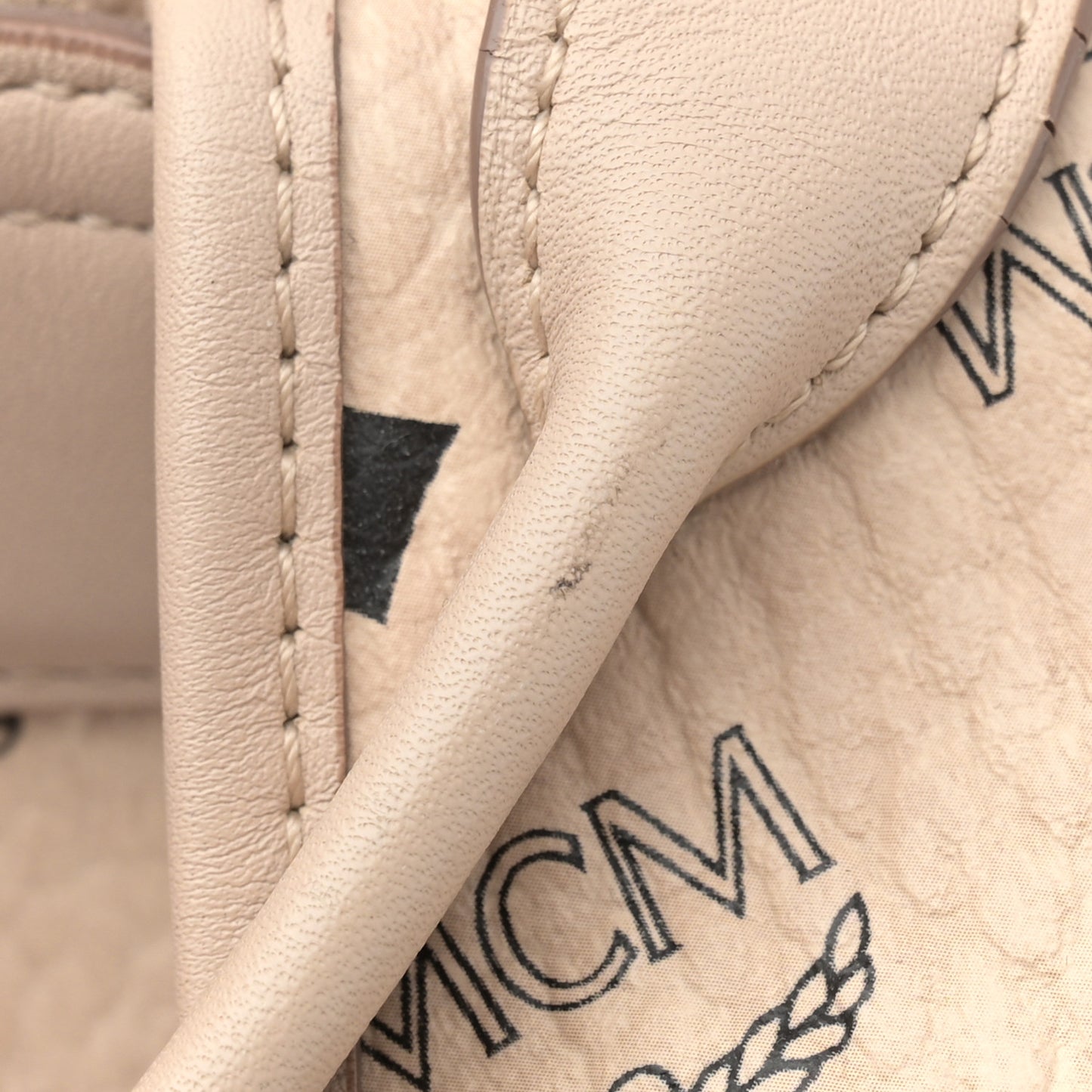 This is an authentic MCM Visetos Medium Studded Stark Backpack in Beige. This backpack is crafted of MCM logo print coated canvas in beige and black. The backpack features side pockets with studs, a front zipper pocket, a rolled leather top handle, and adjustable shoulder straps. The top zipper opens to a black leather interior with pockets.Follow this item for alerts. MCM is a registered trademark of MCM. FASHIONPHILE is not affiliated with MCM.