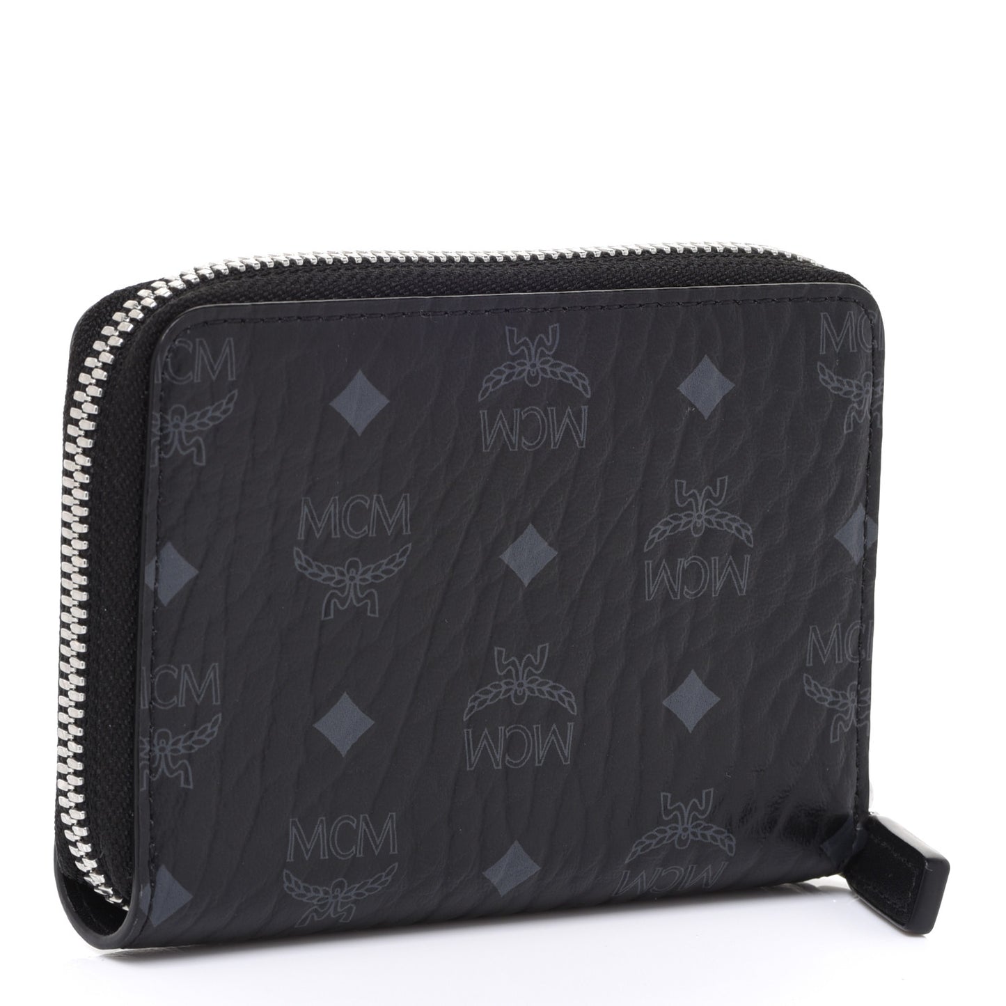This is an authentic MCM Visetos Mini Zip Around Wallet in Black. This wallet is crafted of MCM Visetos monogram coated canvas. The snap opens to a matching leather and fabric interior with a center zipper compartment and card slots.Follow this item for alerts. MCM is a registered trademark of MCM. FASHIONPHILE is not affiliated with MCM.