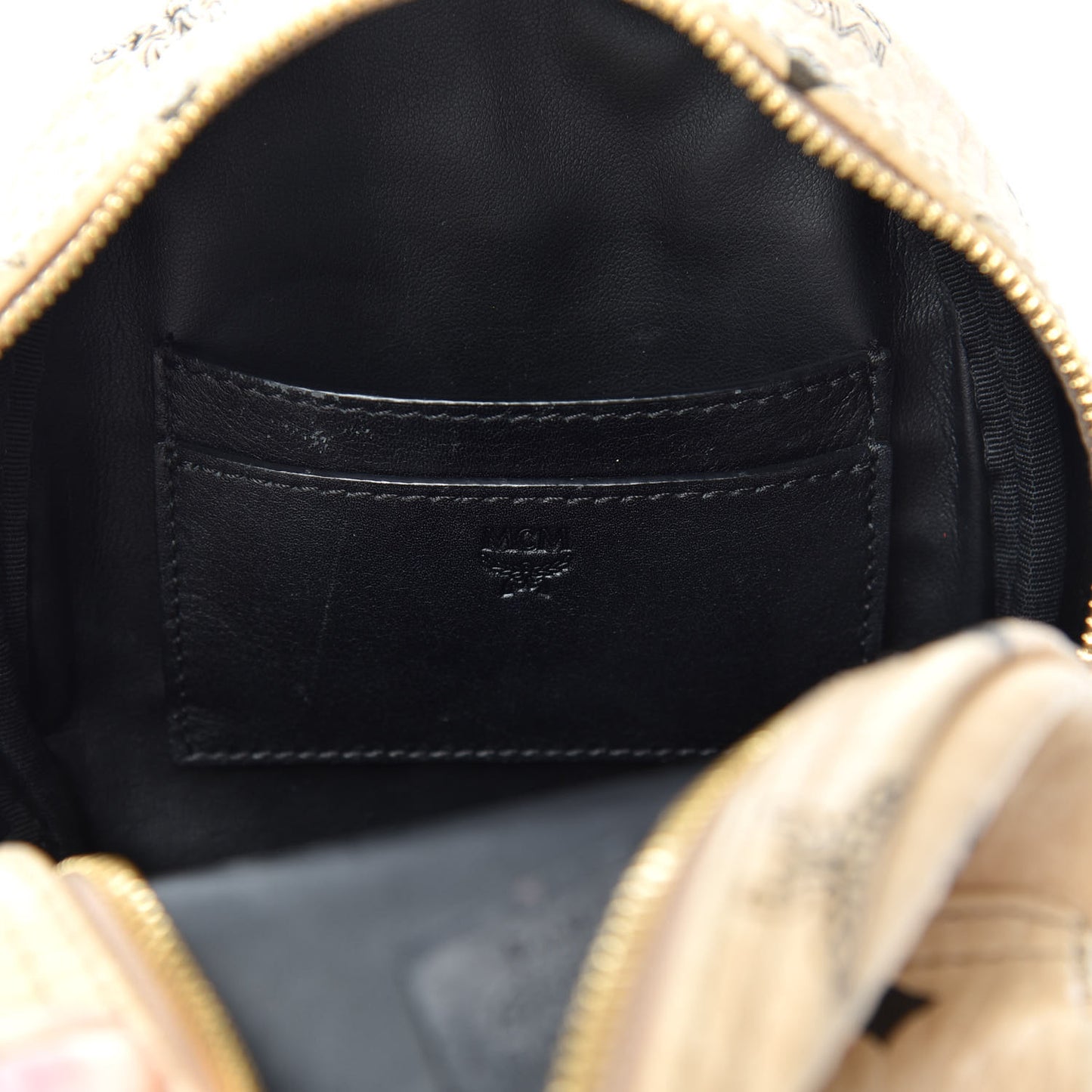 This is the authentic MCM Visetos Side Stud X-Mini Stark Backpack in Beige. This backpack is crafted of MCM monogram visetos coated canvas in beige. The bag features a rolled leather top handle, adjustable beige nylon shoulder straps, a gold studded patch pocket on either side and a zipper pocket on the front. The wrap-around zipper opens to a black leather interior with card slots.Follow this item for alerts. MCM is a registered trademark of MCM. FASHIONPHILE is not affiliated with MCM.