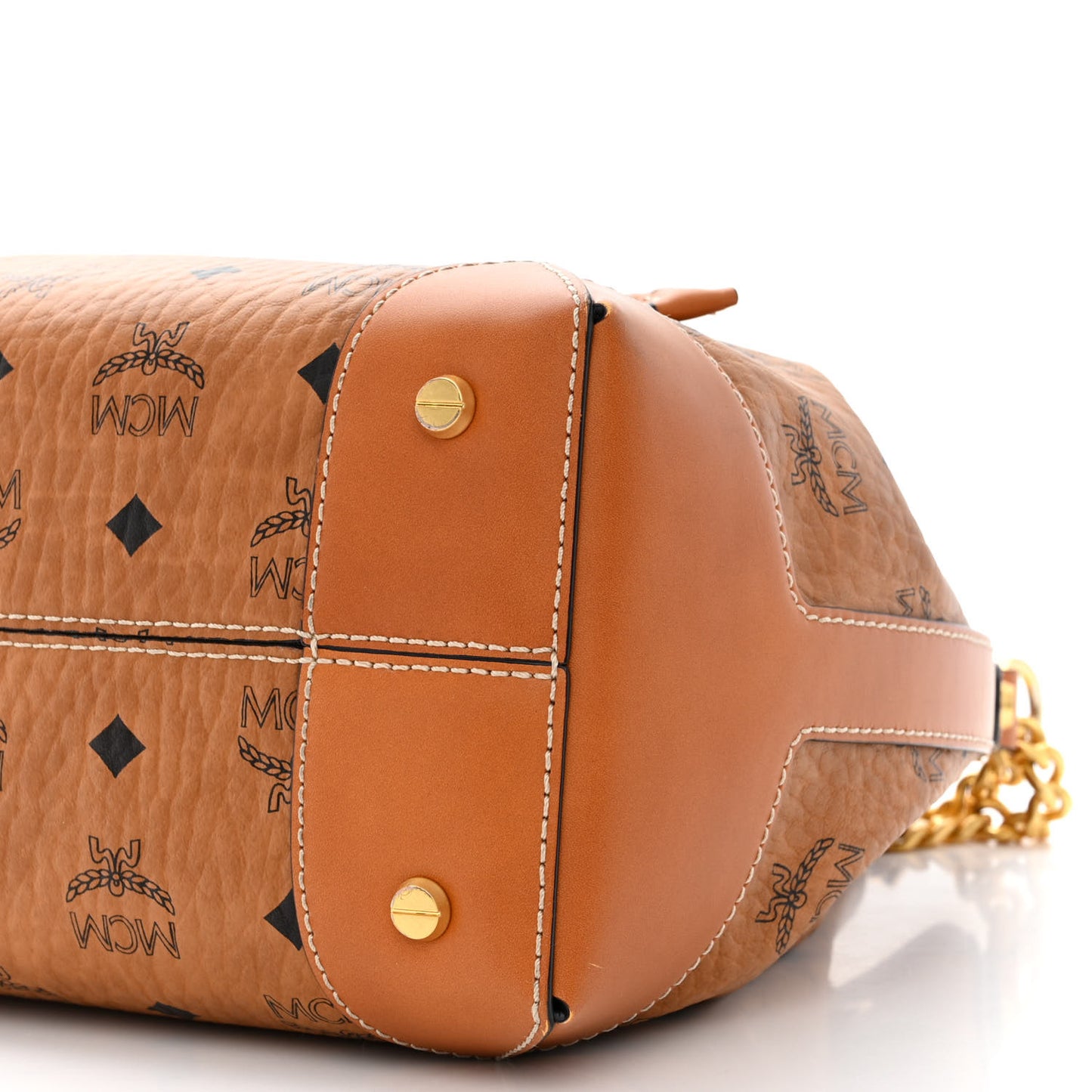 This is an authentic MCM Visetos Small Soft Berlin Drawstring Bucket Bag in Cognac. This is a tote crafted of MCM monogrammed coated canvas in harvest gold brown. The handbag features a gold chain shoulder strap with a leather shoulder pad and a cinch cord. The top opens to a beige fabric interior with zipper and patch pockets.Follow this item for alerts. MCM is a registered trademark of MCM. FASHIONPHILE is not affiliated with MCM.
