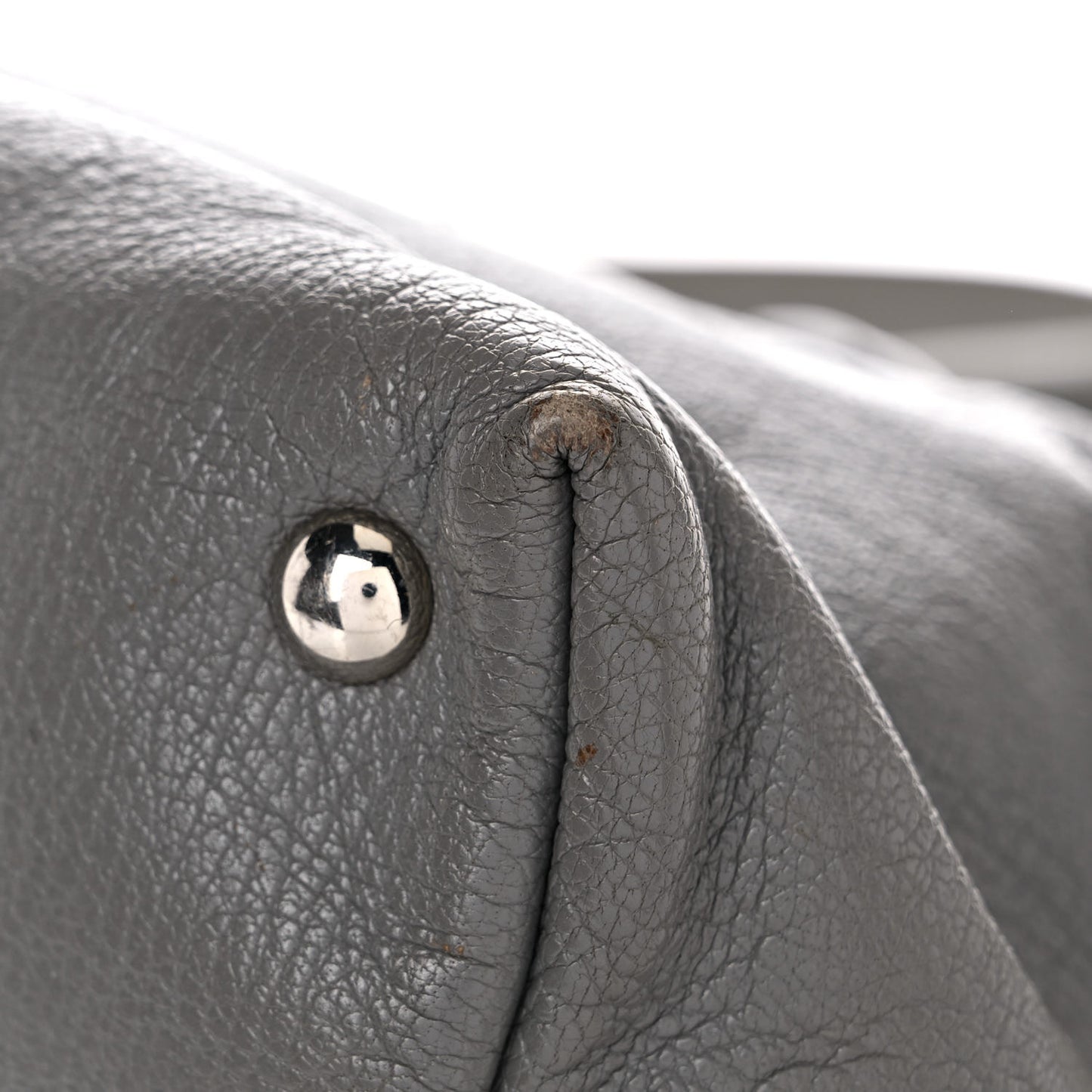 edgeThis is an authentic MIU MIU Goatskin Madras Zip Tote in Gray. This stylish tote is crafted of soft, textured goatskin leather in gray. The bag features rolled leather top handles, an optional adjustable shoulder strap and expandable zipped sides with polished brass hardware. The top zipper opens to a gray fabric and satin interior with zipper and patch pockets.Follow this item for alerts. Miu Miu is a registered trademark of Miu Miu. FASHIONPHILE is not affiliated with Miu Miu.