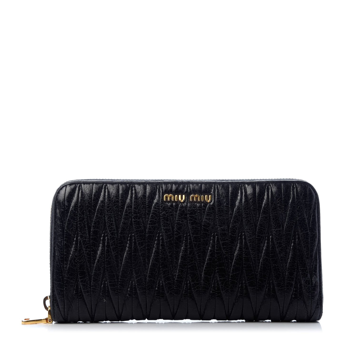 This is an authentic MIU MIU Matelasse Zip Around Wallet in Black. This clutch wallet has distinctive pleated matelasse leather in black. It features a wrap around zipper that opens to a central bill compartment and a zipper pocket partition with a card slot panel on each side and wide patch pockets. This is an excellent clutch for your bag or a grab-and-go for essentials with the unique chic of Miu Miu.Follow this item for alerts. Miu Miu is a registered trademark of Miu Miu. FASHIONPHILE is not affiliated with Miu Miu.