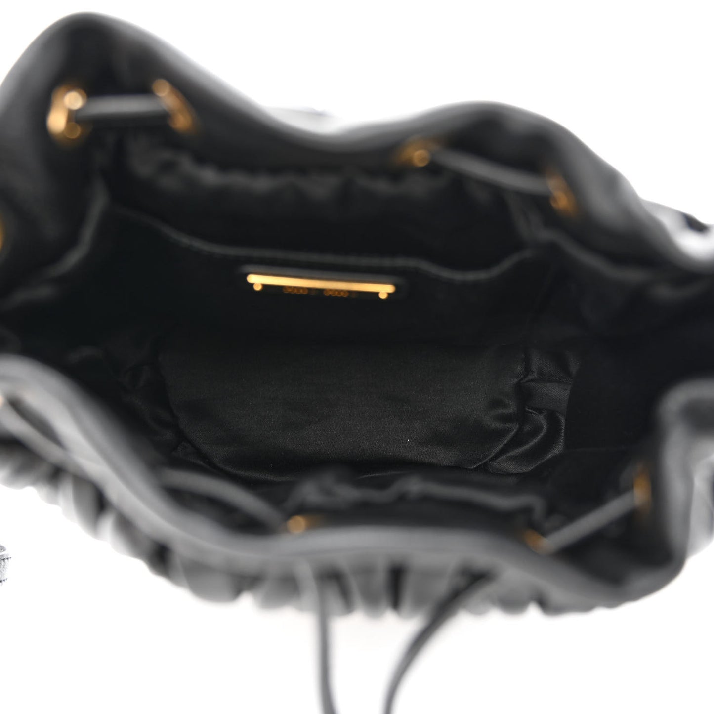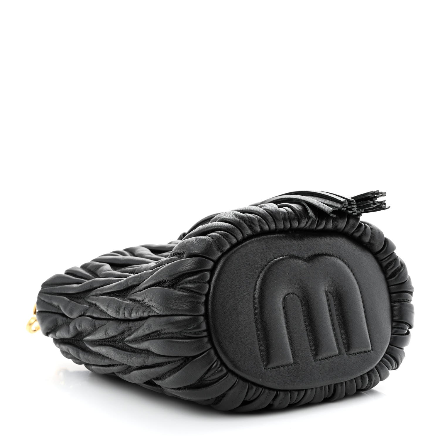 This an authentic MIU MIU Nappa Matelasse Small Bucket Bag in Black. This chic bucket bag is crafted of matelasse pleated lambskin leather in black, with gold hardware. The handbag features an adjustable leather shoulder strap and a tasseled cinch cord closure. The top is open to a black satin fabric interior with a patch pocket.Follow this item for alerts. Miu Miu is a registered trademark of Miu Miu. FASHIONPHILE is not affiliated with Miu Miu.