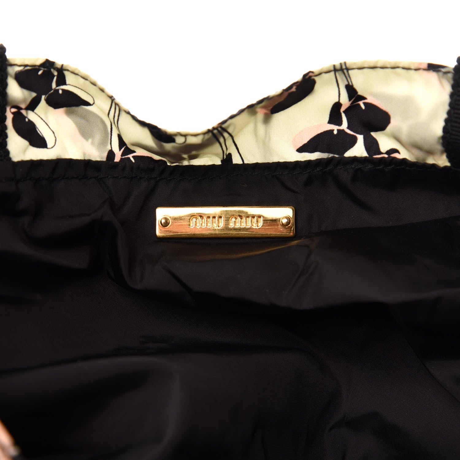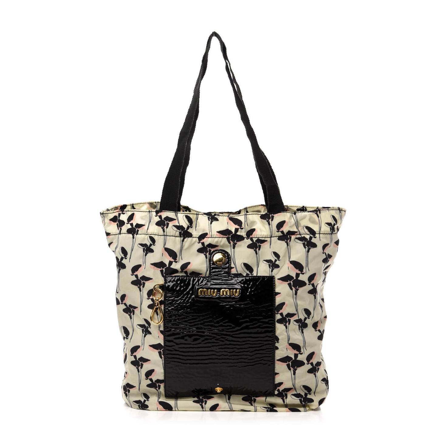 This is an authentic MIU MIU Faille Foldable Tote. This stylish tote folds out of its attached patent leather folder and becomes a tote bag with a floral print. The bag features fabric handles, and polished brass hardware. The opens to a spacious black nylon interior.Follow this item for alerts. Miu Miu is a registered trademark of Miu Miu. FASHIONPHILE is not affiliated with Miu Miu.