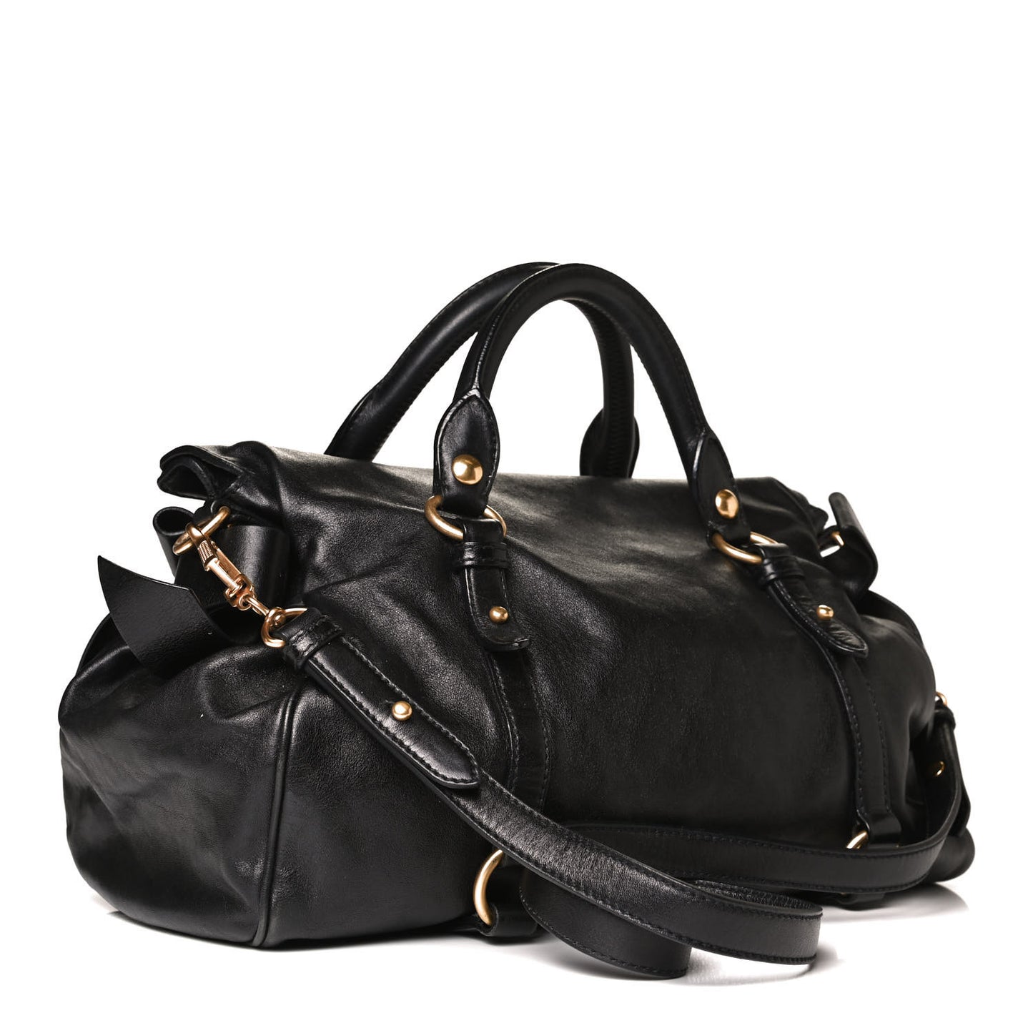 This is an authentic MIU MIU Vitello Lux Bow Tote in Black. This chic bag is crafted of textured leather in black with large leather bows on the sides. This tote features rolled leather top handles, an optional shoulder strap, belt embellishments, and polished brass hardware. The fold-over zip top opens to a black fabric interior with zipper and patch pockets.Follow this item for alerts. Miu Miu is a registered trademark of Miu Miu. FASHIONPHILE is not affiliated with Miu Miu.
