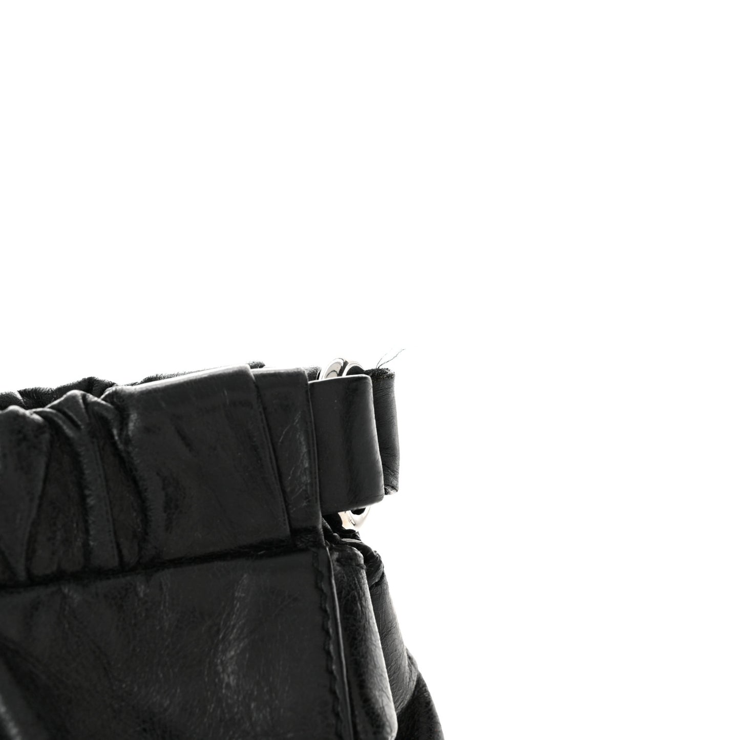 This is an authentic MIU MIU Vitello Lux Gathered Tote in Black. This stylish tote is crafted of distressed black leather that is gathered at the top. The bag features rolled leather top handles, an optional leather shoulder strap, and silver hardware. This opens with a button snap to a black fabric interior with a zipper pocket.Follow this item for alerts. Miu Miu is a registered trademark of Miu Miu. FASHIONPHILE is not affiliated with Miu Miu.