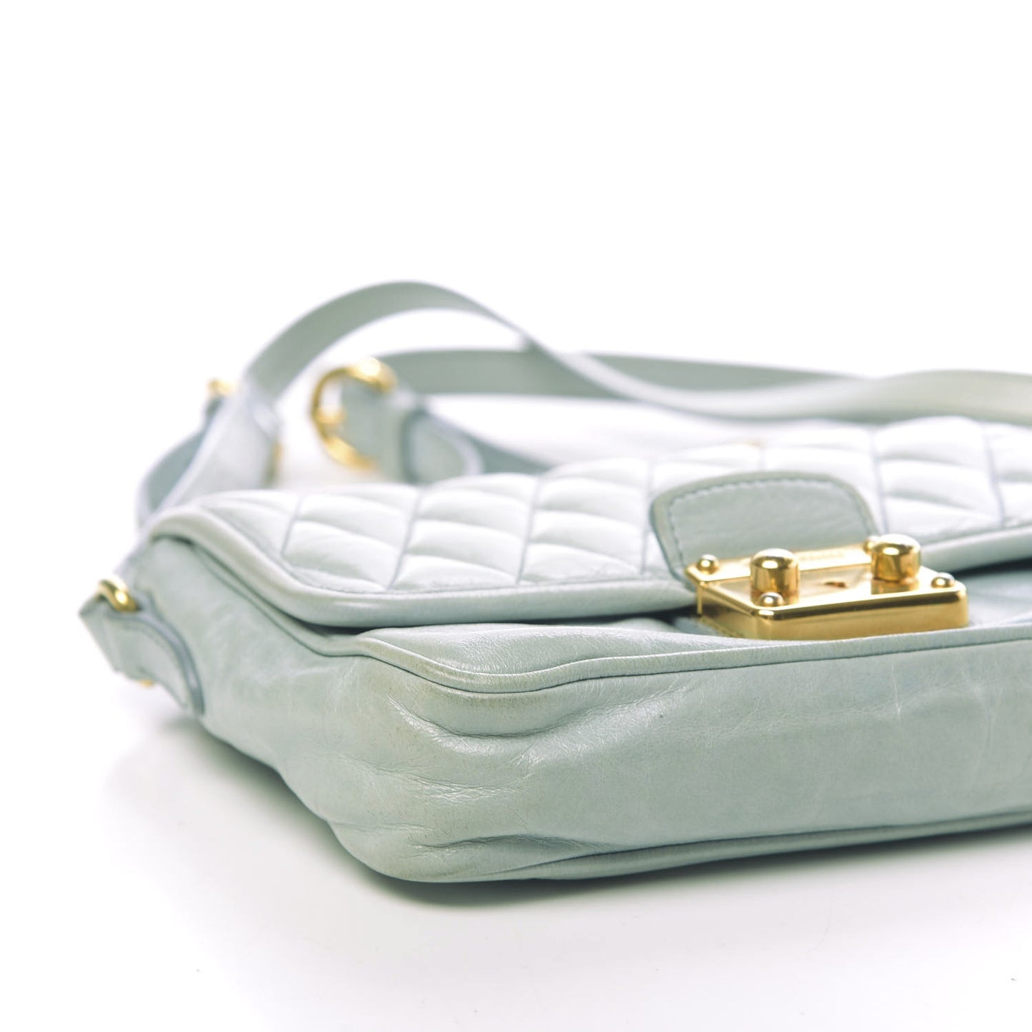 This an authentic MIU MIU Vitello Shine Trapu Crossbody Bag in Astrale. This chic bag is crafted of luxurious goatskin leather in light blue and features an adjustable shoulder strap. The bag has a front half flap with a brass press lock that opens to a blue satin fabric interior with zipper and patch pockets.Follow this item for alerts. Miu Miu is a registered trademark of Miu Miu. FASHIONPHILE is not affiliated with Miu Miu.