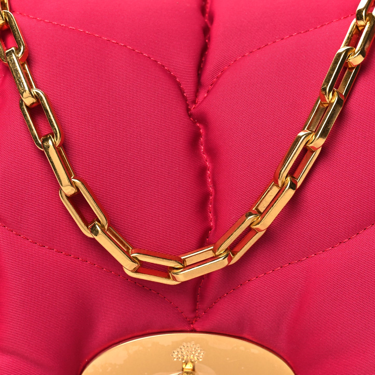 This is an authentic MULBERRY Recycled Nylon Quilted Little Softie Bag in Mulberry Pink. This bold small bag is crafted of stuffed quilting in pink and comes with a removable shoulder strap. The gold Postman's turn lock opens to a nylon interior.