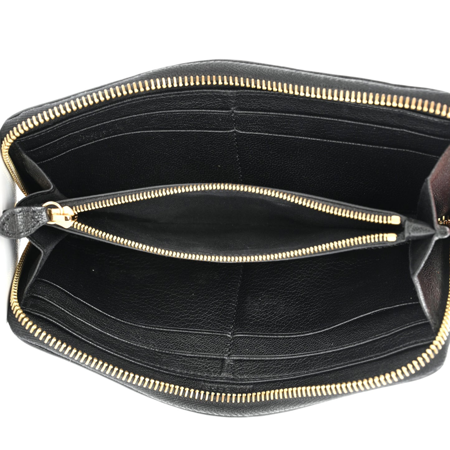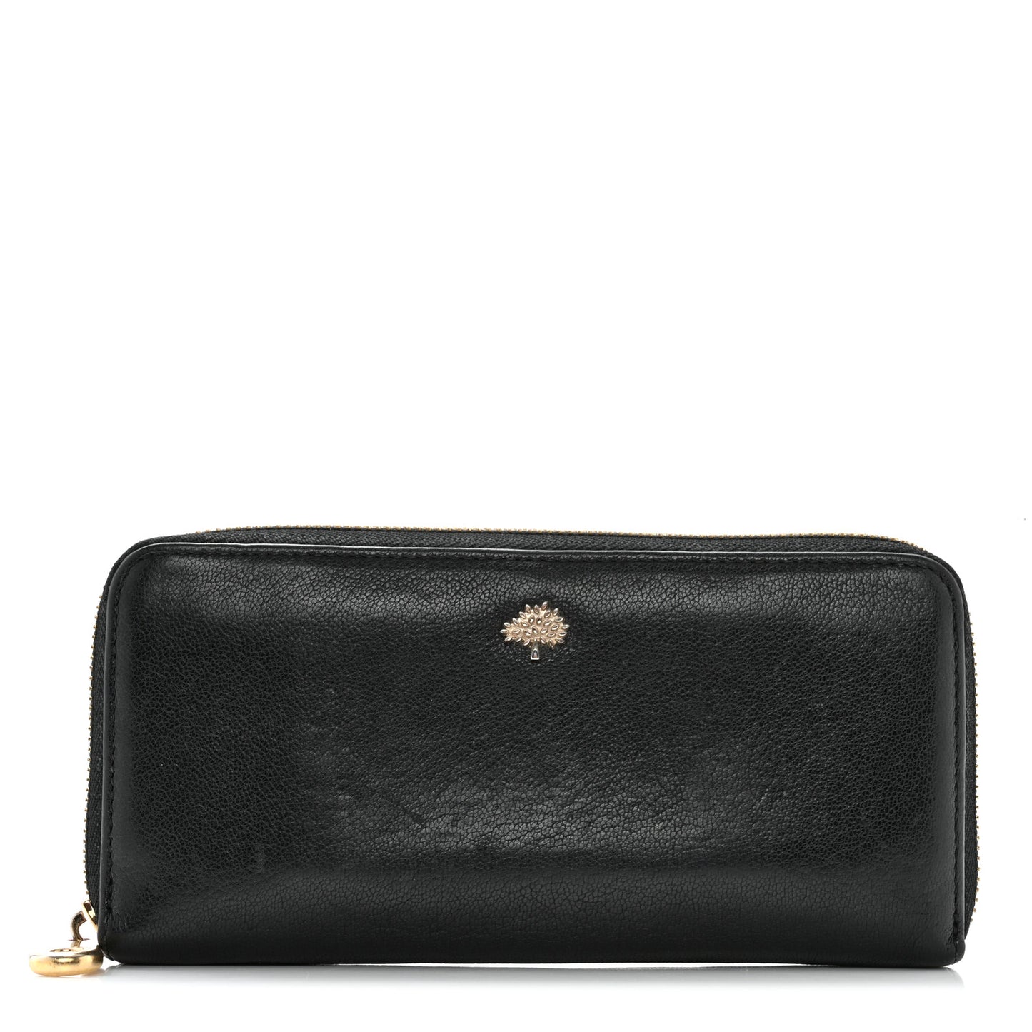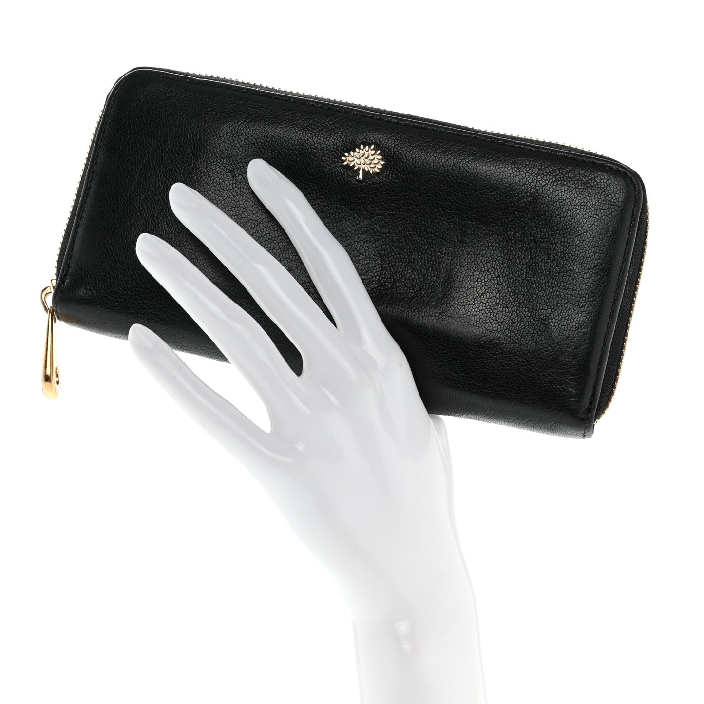 This is an authentic MULBERRY Shiny Goatskin Tree Zip Around Wallet Black. This stylish wallet is crafted of soft black goatskin leather with a Mulberry logo on the face. There is a 3/4 polished gold tone zipper that opens to a matching leather interior with two card slot panels, a central zipper compartment, patch pockets and two open compartments.Follow this item for alerts. Mulberry is a registered trademark of Mulberry. FASHIONPHILE is not affiliated with Mulberry.